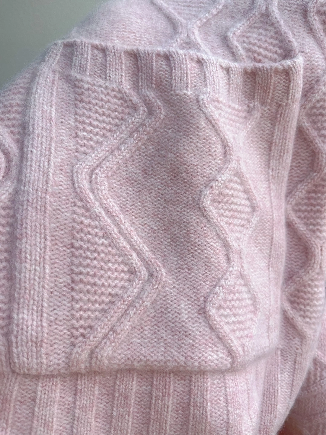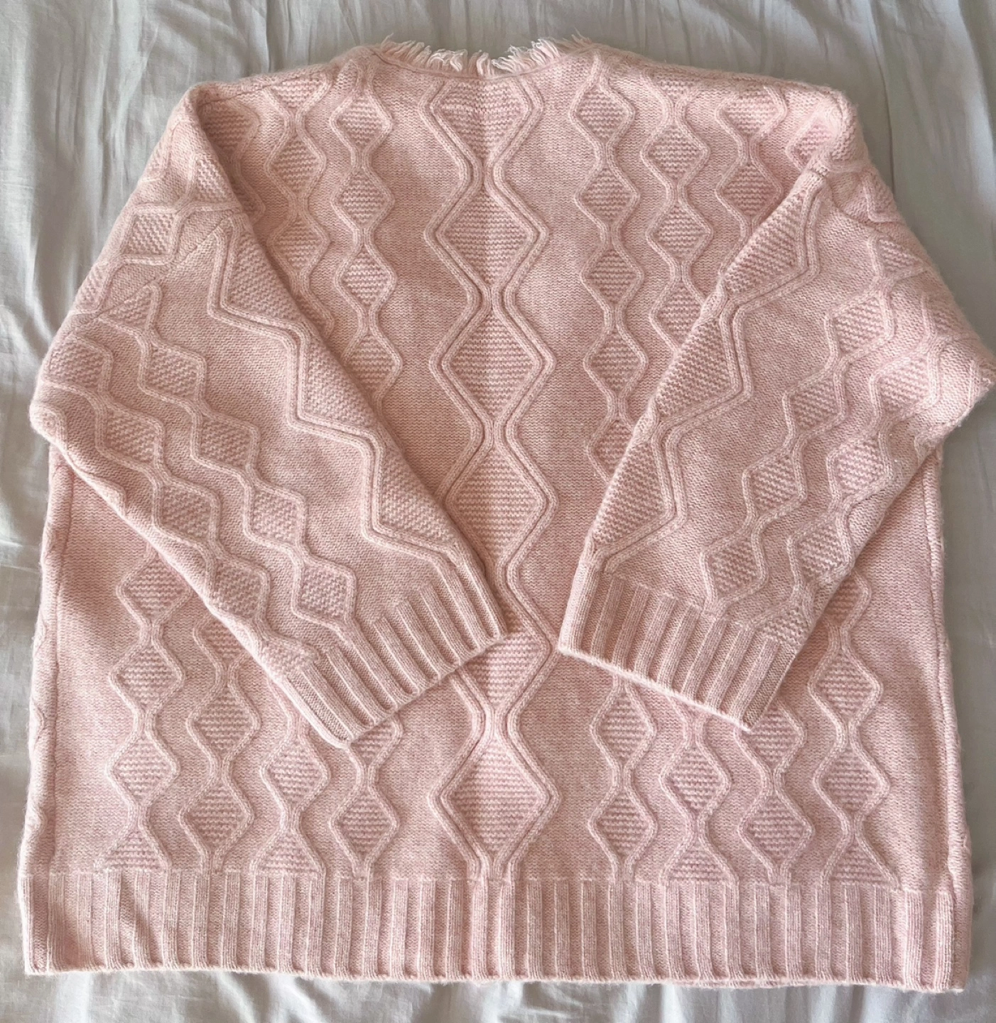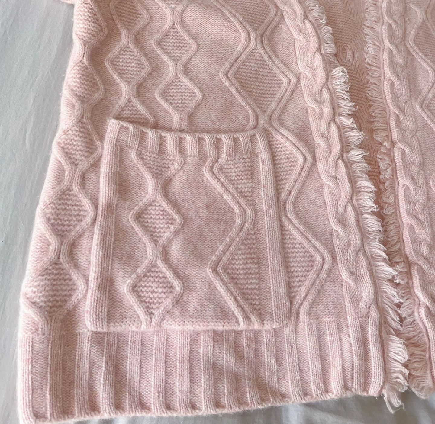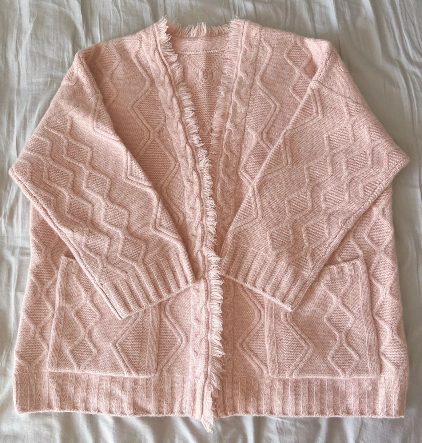 Lovely pink cashmere cardigan. Buttonless cardigan . This cashmere cardigan is thick and warm .Features cable knit pattern, frayed edges, and pockets. 100% cashmere.Only worn once.Cash only