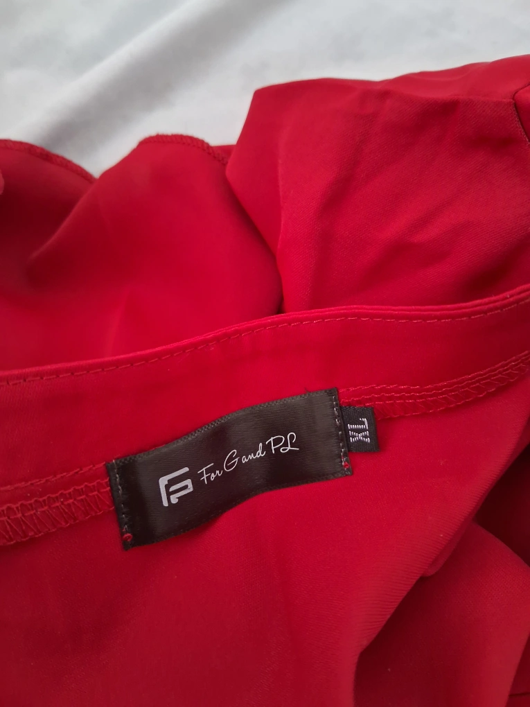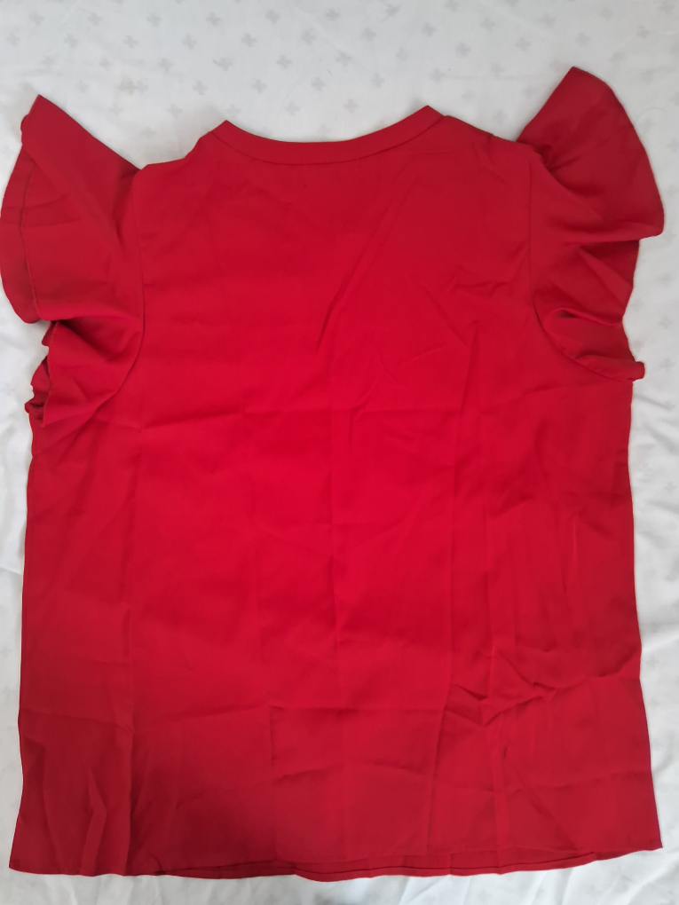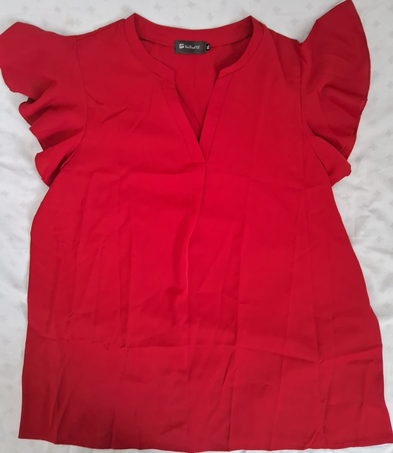 Women's red blouse. Short flutter sleeves. V-neck. Lightweight fabric. Great for spring or summer.