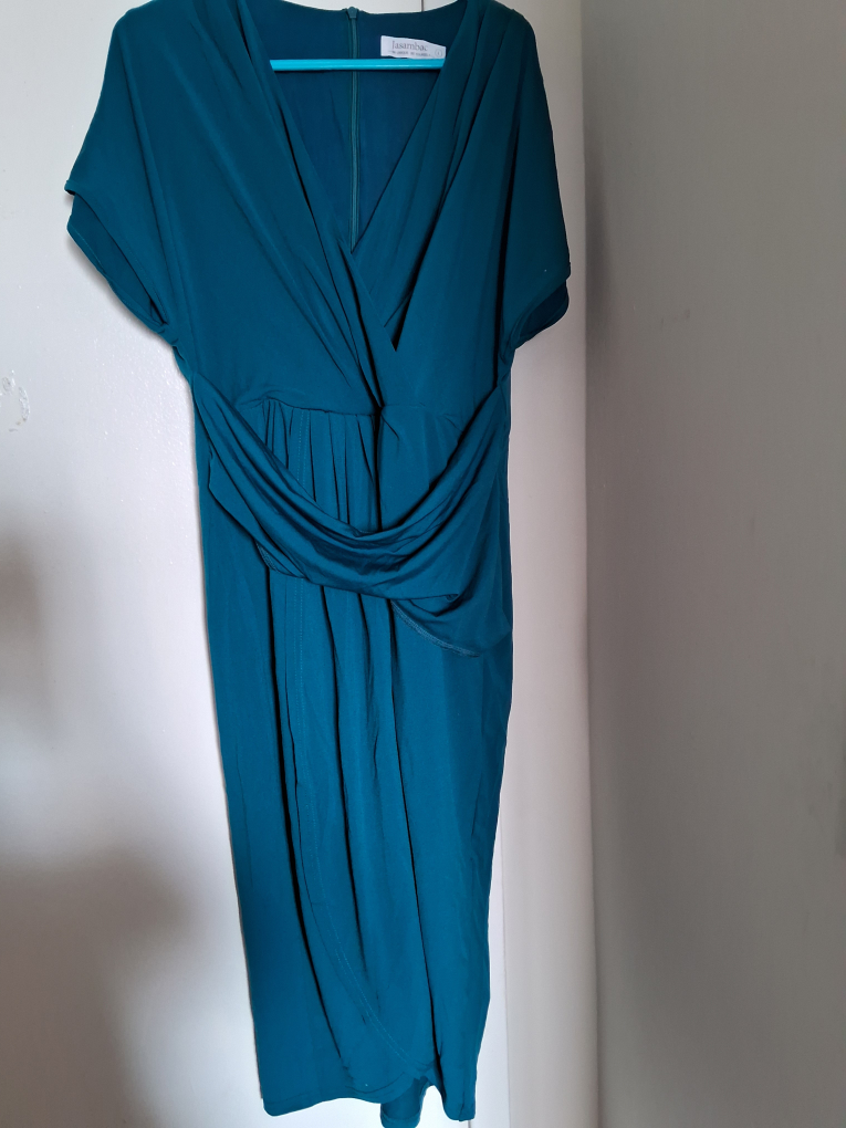 Beautiful teal wrap dress. Short sleeves. Knee-length. Excellent condition.