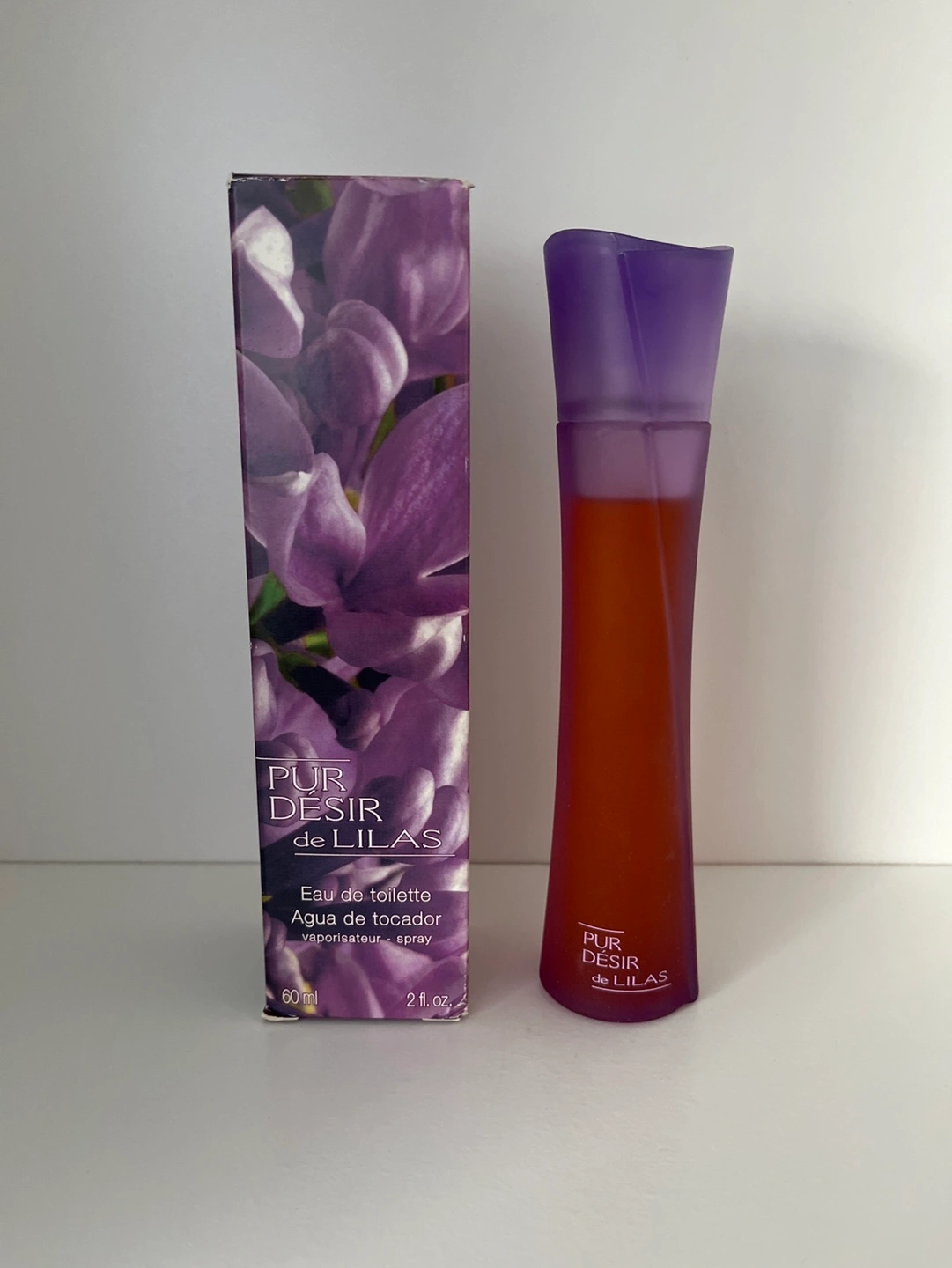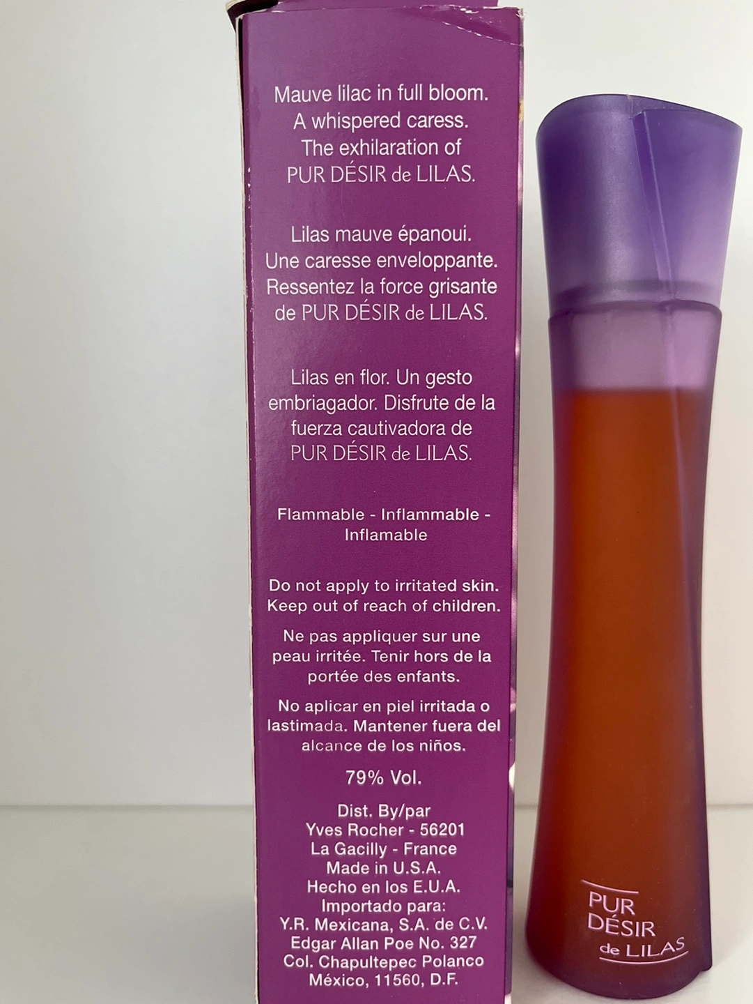 2 fl oz / 60 ml bottle of Pur Désir de Lilas Eau de Toilette by Yves Rocher. Purple bottle and box. Lilac scent. New, unopened. Box a little damaged from being in storage.