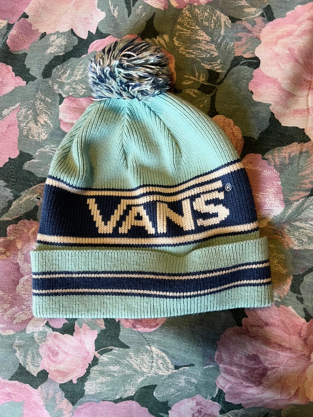 Vans knit beanie. Features a pom-pom on top. Mint green, navy, and off-white colour scheme. Soft and cozy. Perfect for winter.