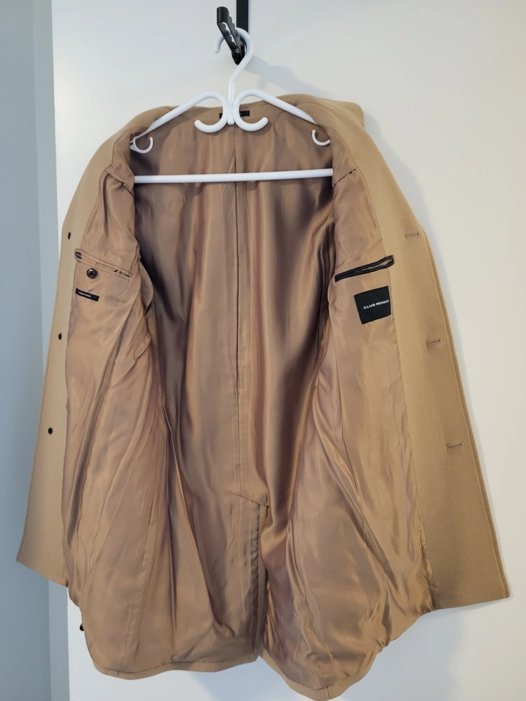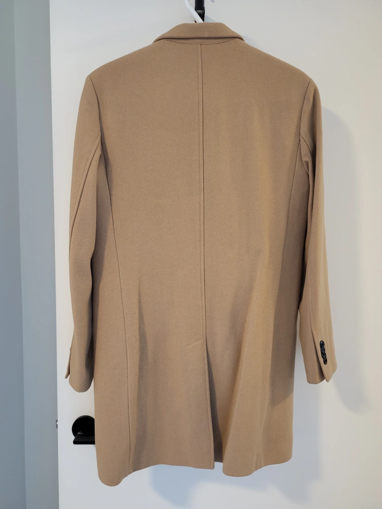 Men's camel coloured wool coat. Features a classic design, button closure, and welt pockets. Excellent for colder weather. NEW WITH TAGS.