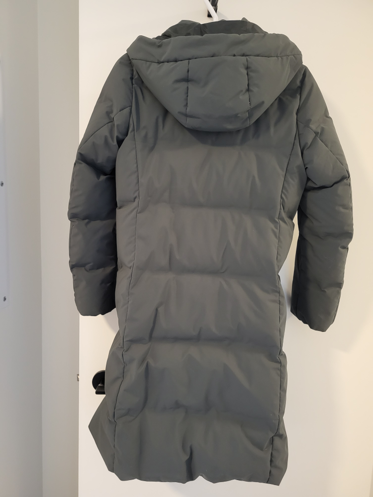 Women's long down jacket. Dark green colour. Features a hood and zipper closure. Inside pockets included. Excellent condition.