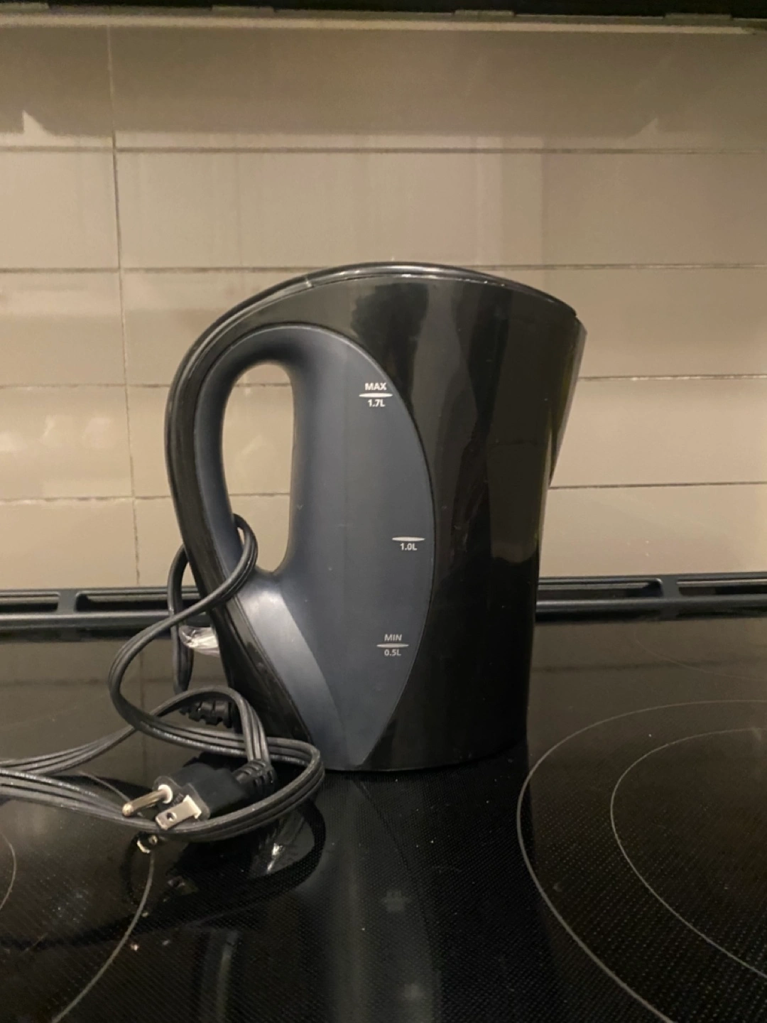 Portable electric kettle. Boils water quickly. Filter is a bit torn. Cord attached. 1.7L maximum capacity.