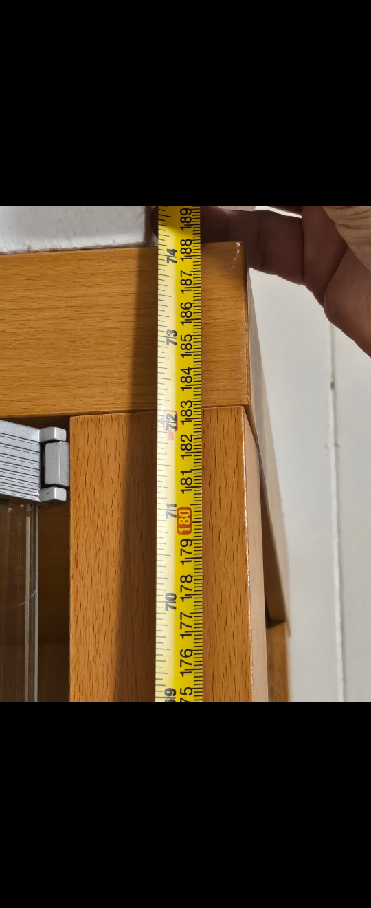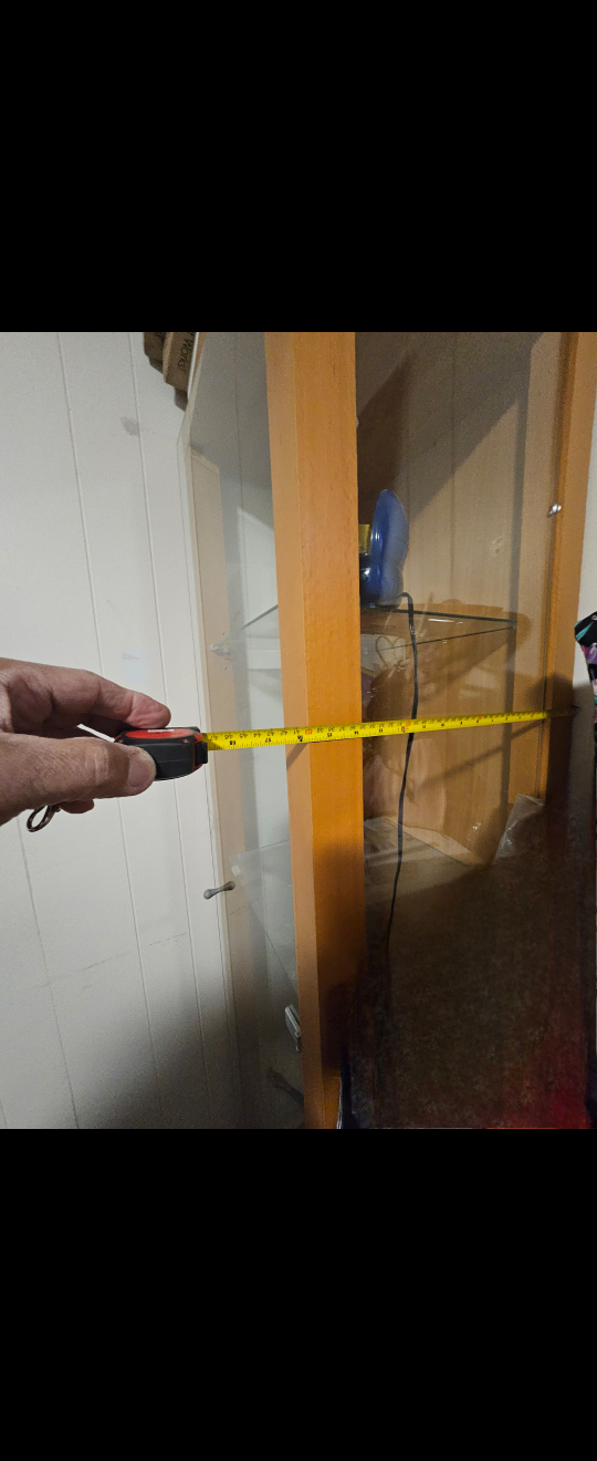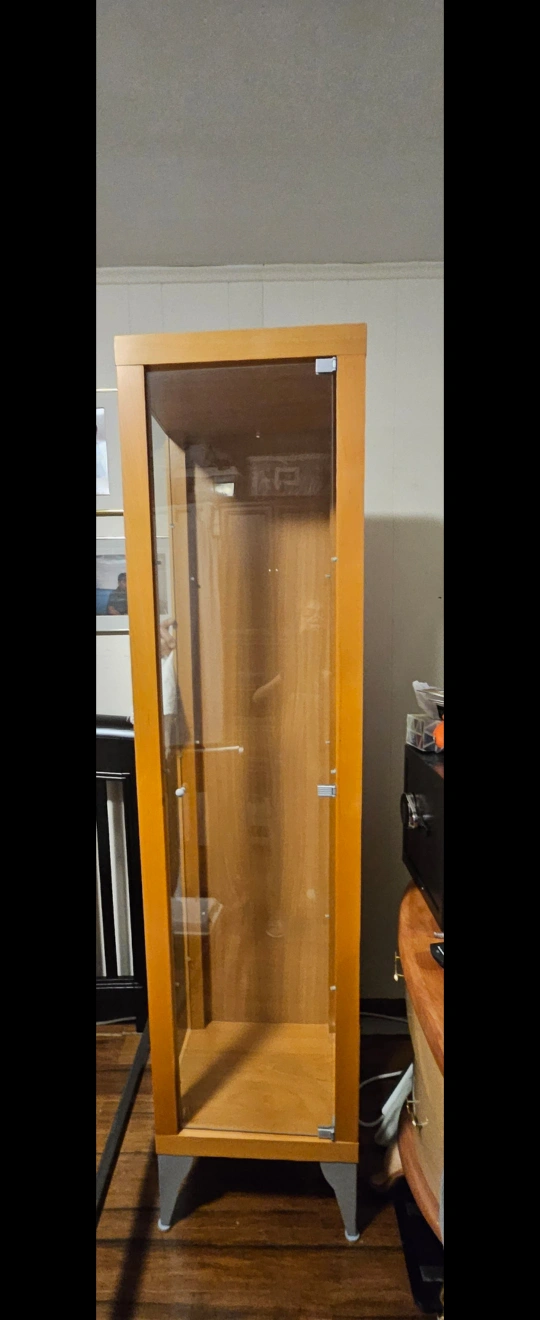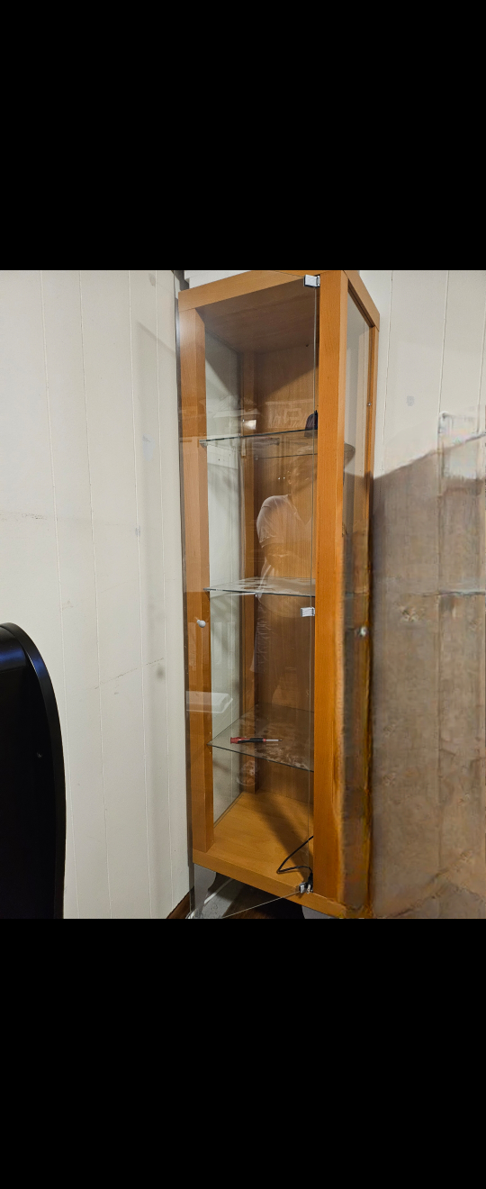 Tall, narrow display cabinet. Light wood finish. Glass shelves and doors. Good for collectibles or showcasing items. Approximately 47" tall, 18" wide. Some minor wear.
