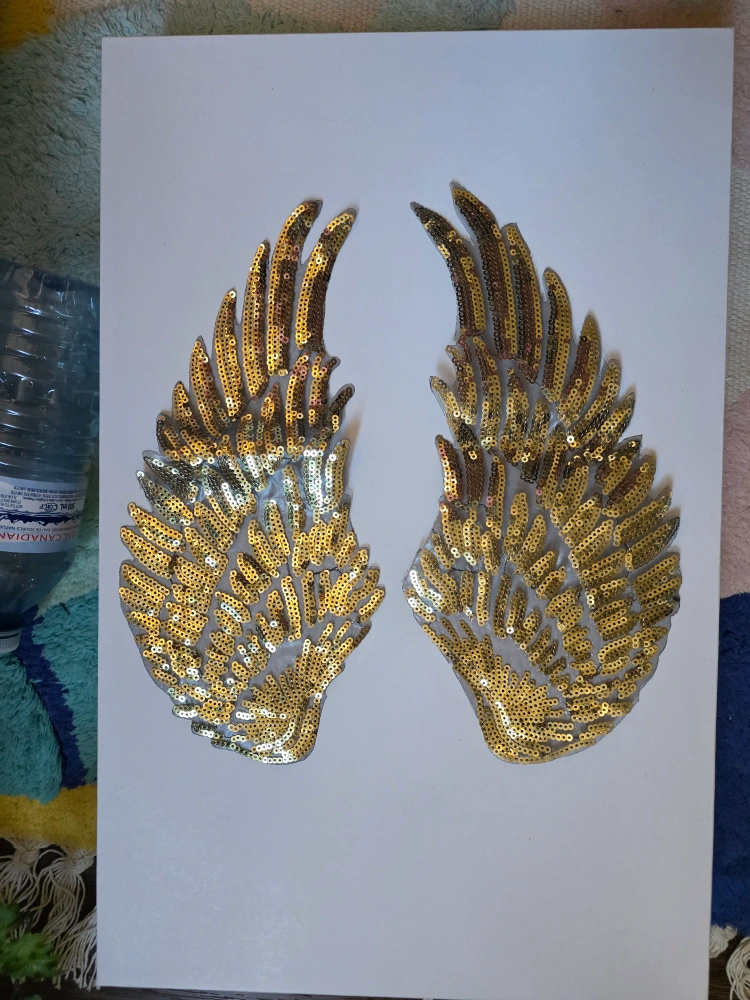 Pair of large gold sequined angel wing patches. Great for jackets, bags, or other projects. Sequins in gold tone. Mesh backing.