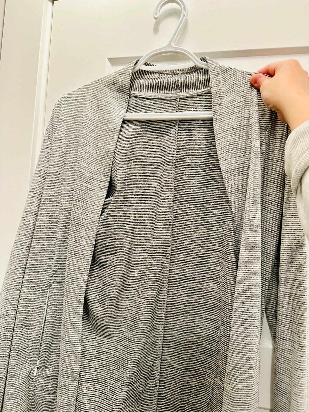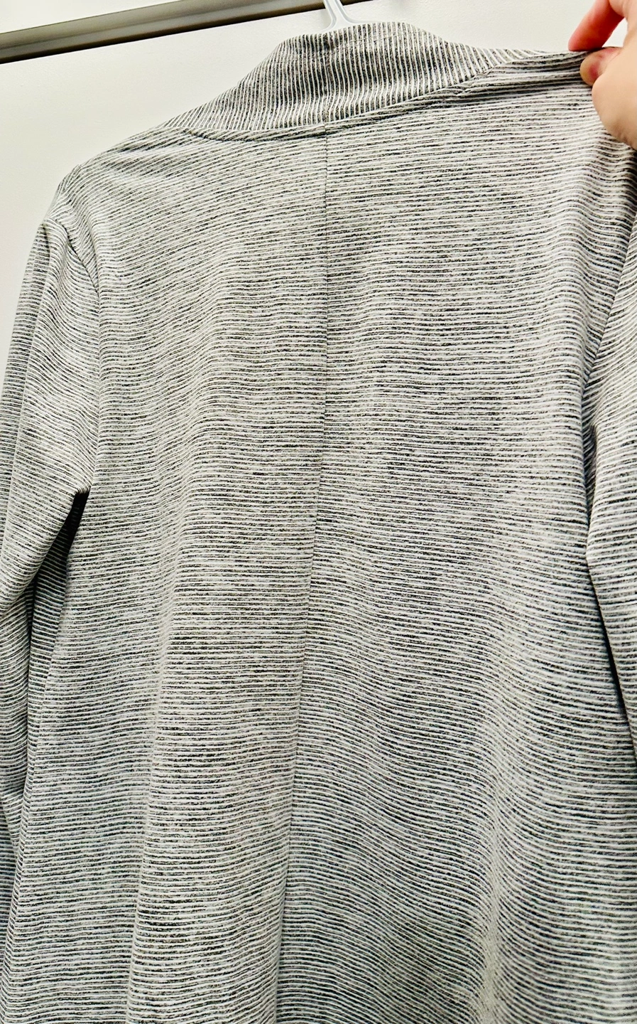 Long-sleeved cardigan, grey with thin black stripes. Open front, side pockets. Moisture-wicking, anti-odor, UV-SPF 40. Made from recycled water bottles. Size medium.