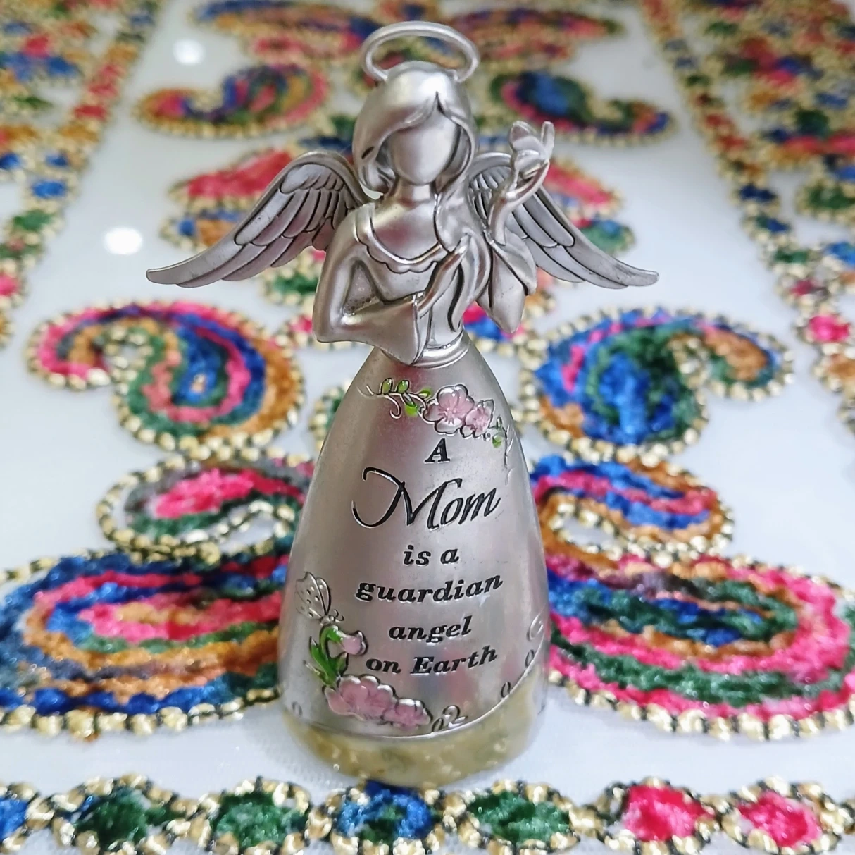 Silver-tone metal angel figurine/ornament. Features wings, halo, and inscription: "A Mom is a guardian angel on Earth". Small pink flowers and butterfly accents.