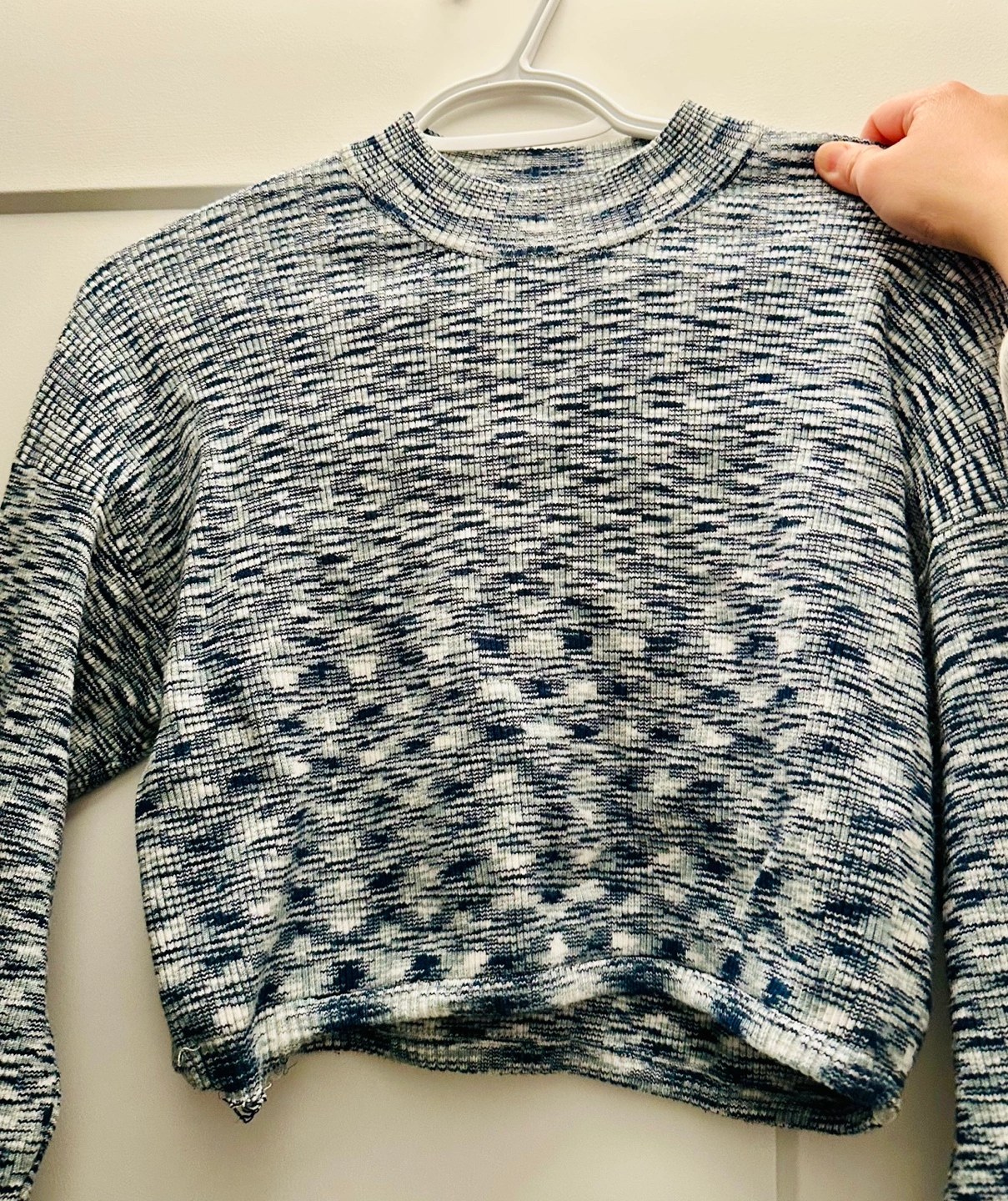 Women's medium sweater. Mock neck. Long sleeves. Blue and white pattern. Cropped length. Knit fabric.