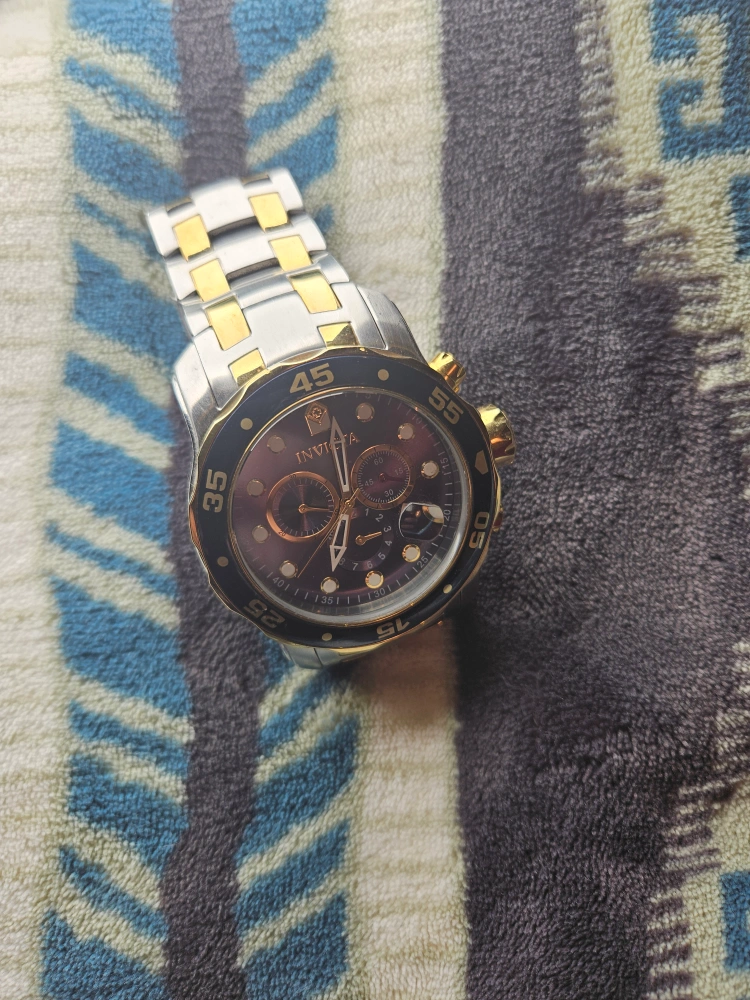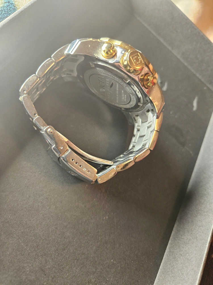 Two-tone stainless steel band. Black face with gold accents. Chronograph features. Quartz movement. Pre-owned.