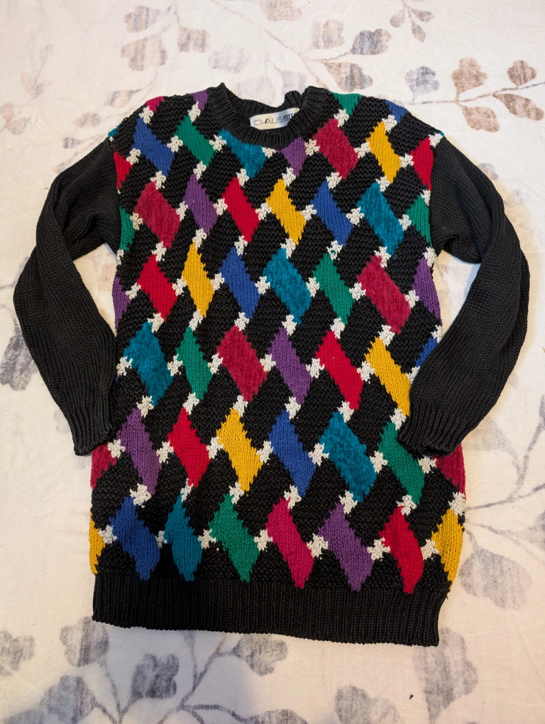 Women's vintage sweater. Black knit with colourful diamond pattern on the front. Some colours are extra soft yarn. Long sleeves. Crew neck. Really fun bright pattern! Worn a few times