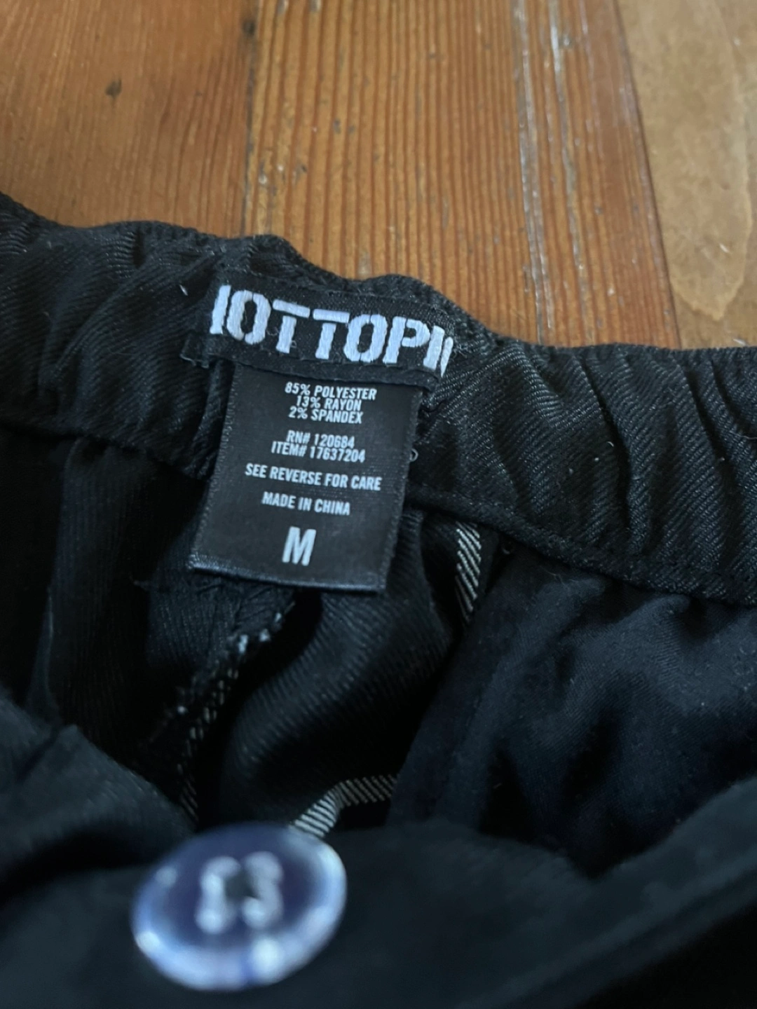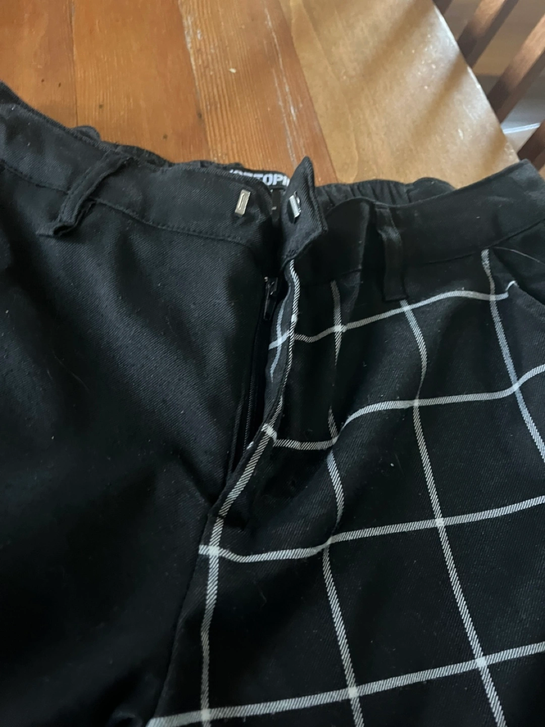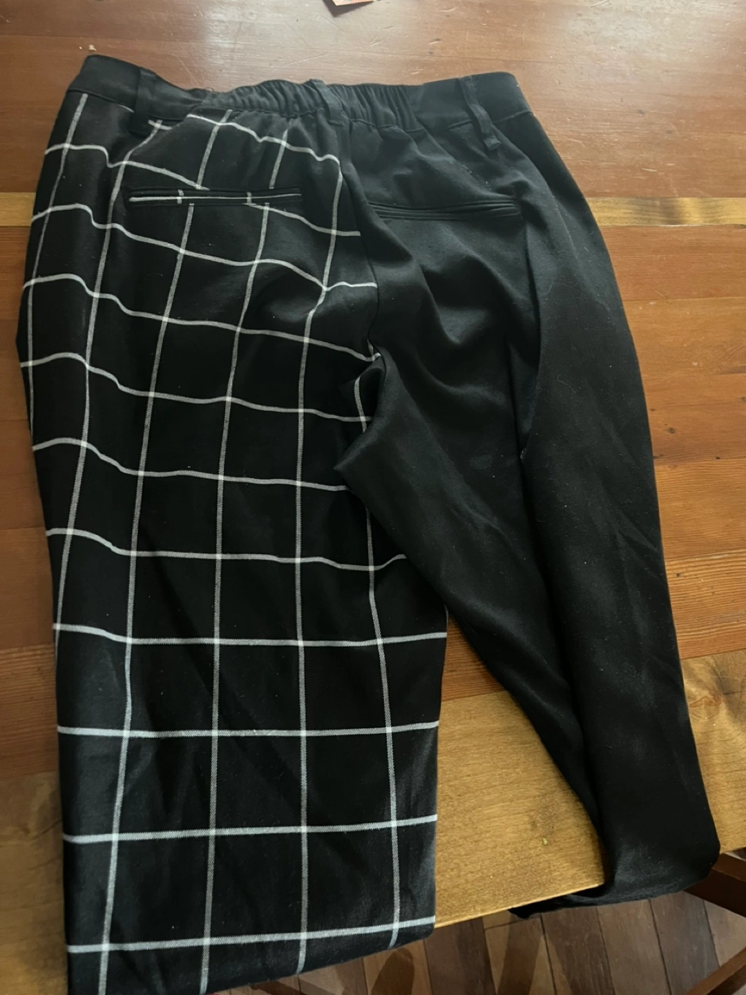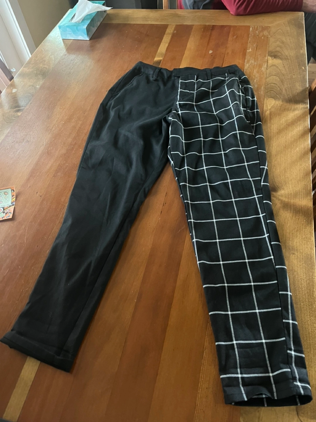 Two colour pants. One leg is solid black, the other is checkered. Men’s medium.