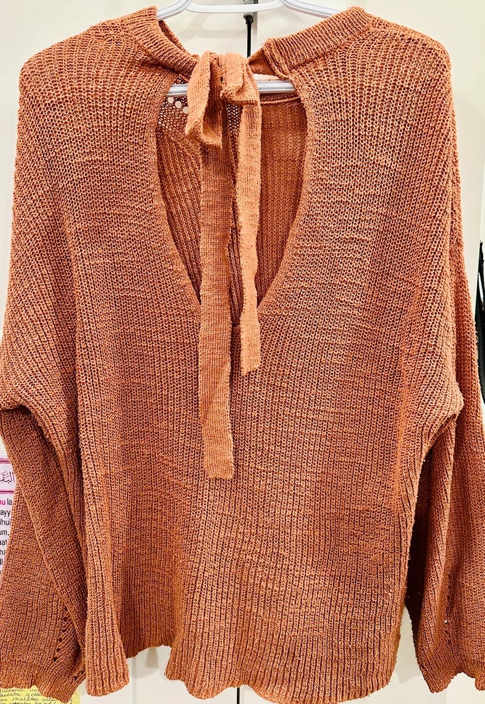 Brown knit sweater, medium size. Features open-knit detailing at neckline and back. Tie detail at back neckline. Relaxed fit. 60% cotton, 40% polyester.