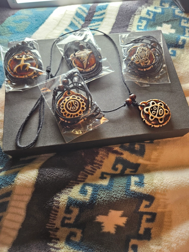 Four unique necklaces featuring bone carving pendants. Each necklace has a black cord. Pendants include various designs.
