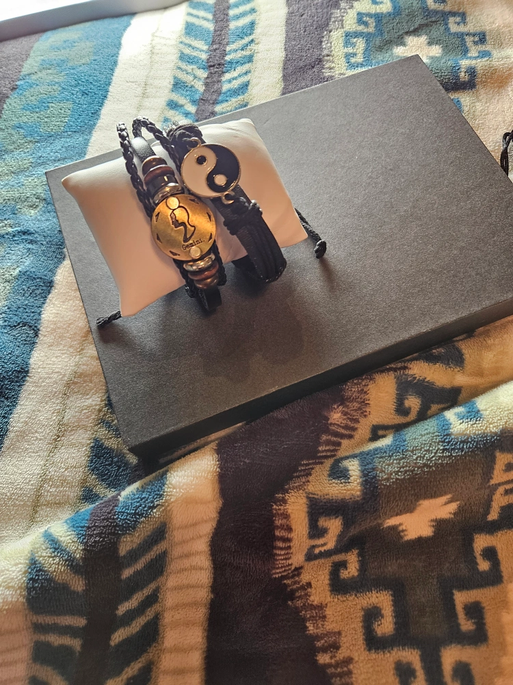 Two leather bracelets. One features a Gemini symbol, the other a Yin Yang symbol. Presented in a black gift box.
