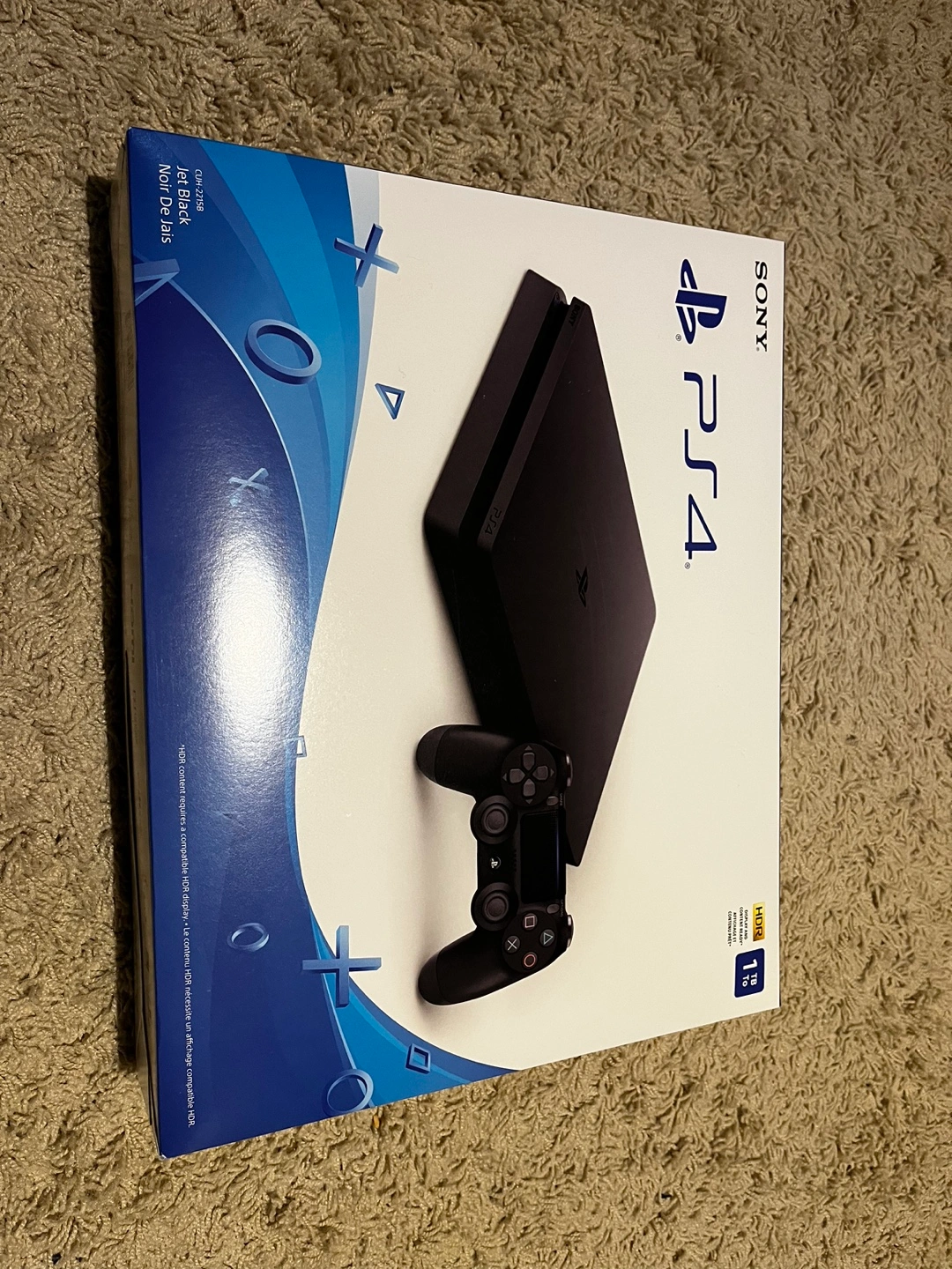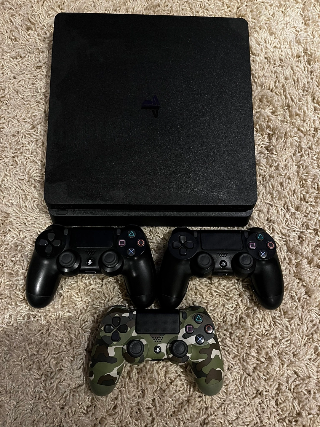 Sony PlayStation 4 Slim console. Includes three controllers; two black and one camouflage. Comes in original box.