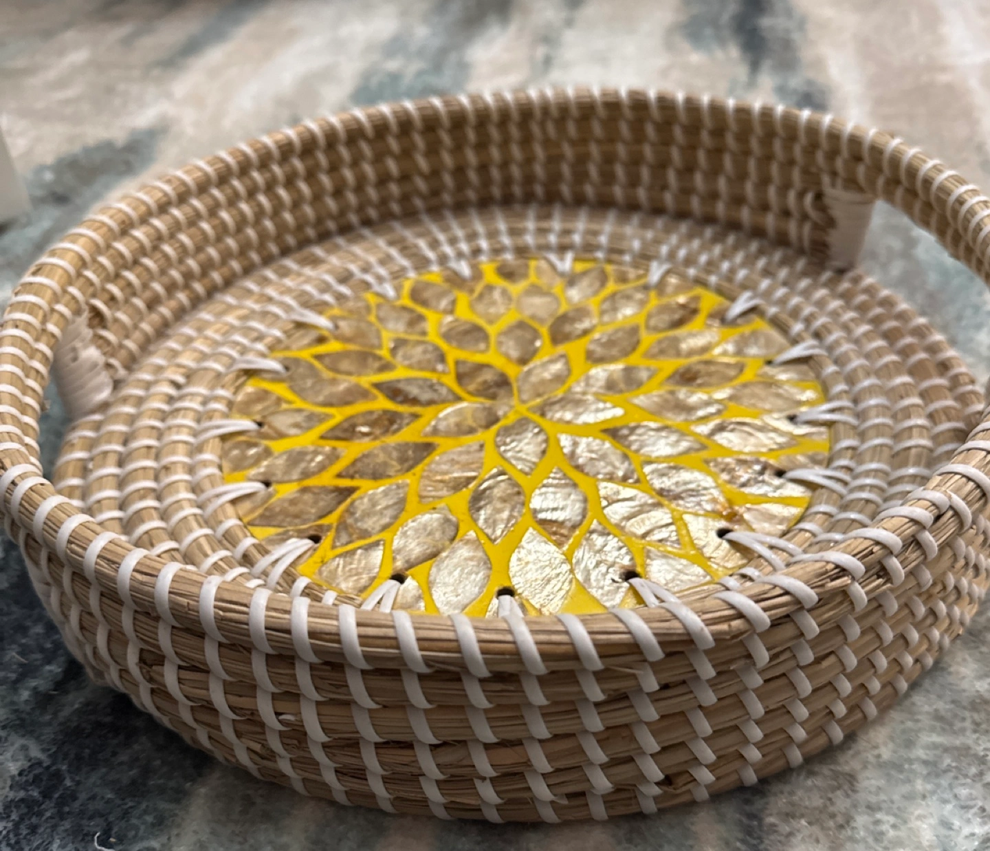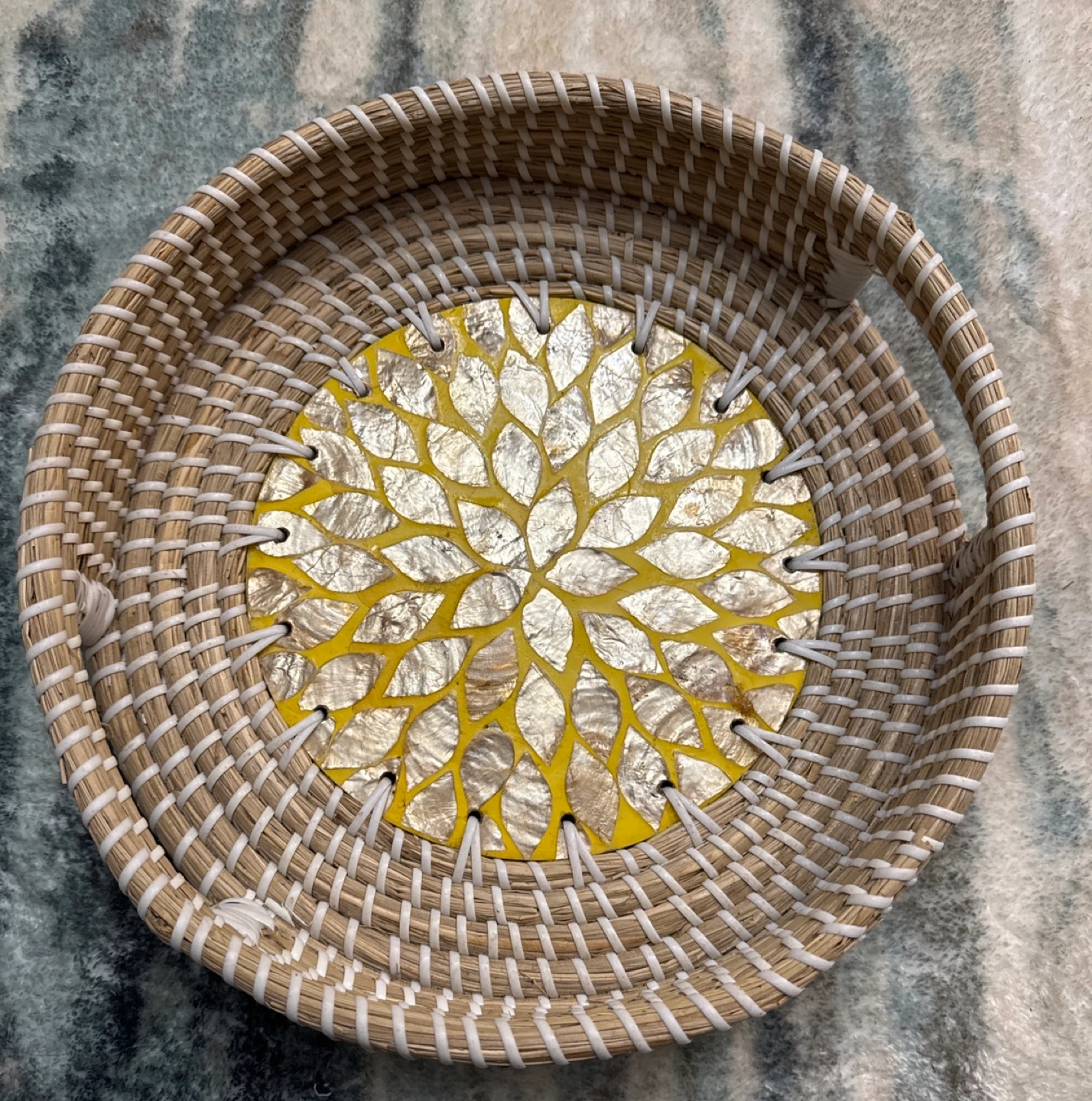 Round woven tray. Features a circular inlay of shell pieces on a yellow background. Perfect for serving or organization. Handcrafted look. Starting price is 25, I will give it to anyone who buys more because this is handmade and expensive.