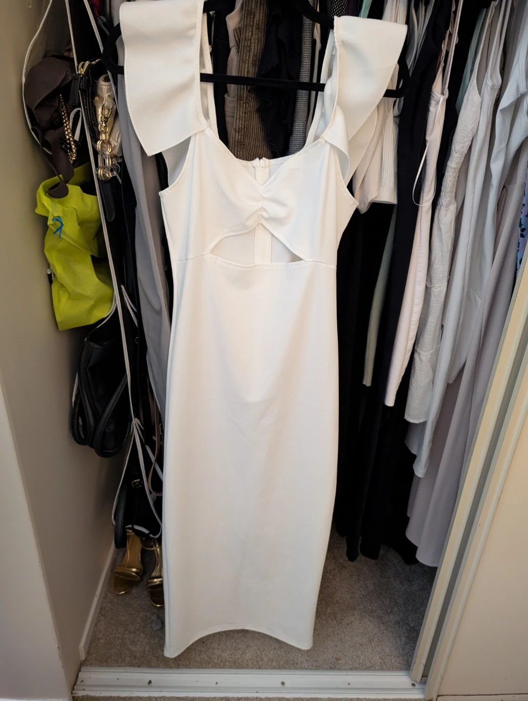This elegant white maxi dress features a flattering cutout detail and off-the-shoulder flutter sleeves. It's a beautiful option for special occasions. Polyester blend material. Shein brand. Nice dress for a special occasion.
