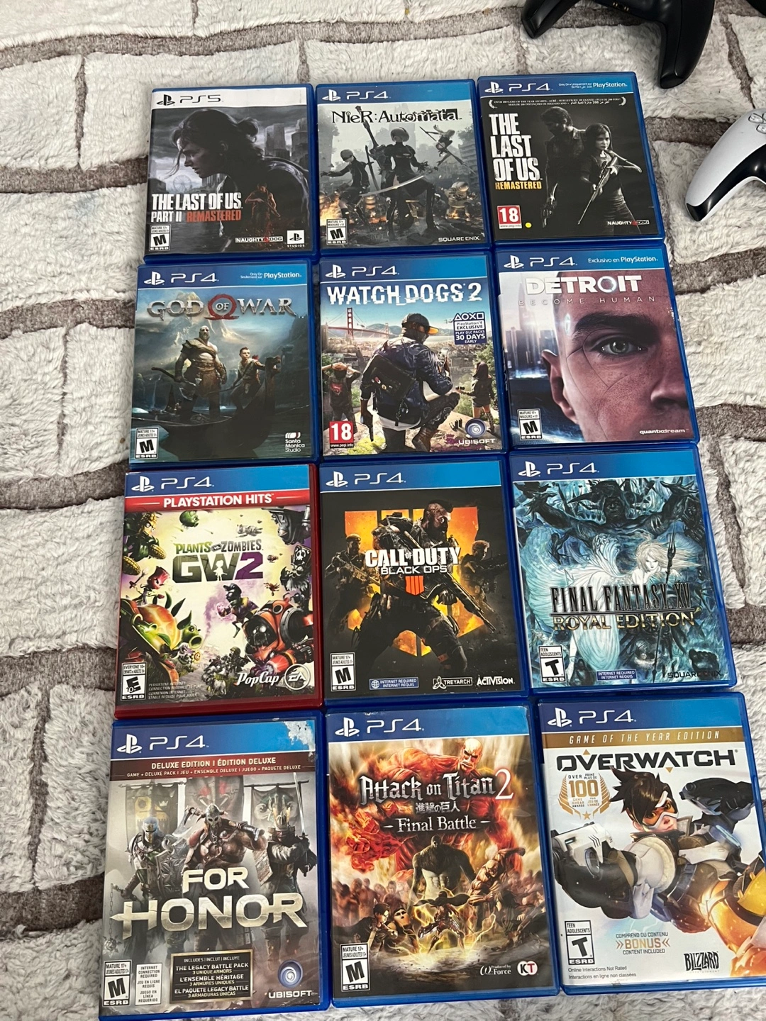 Collection of twelve pre-owned PlayStation 4 games. Titles include:, Nier: Automata, The Last of Us Remastered, God of War, Watch Dogs 2, Detroit: Become Human, Plants vs. Zombies: Garden Warfare 2, Call of Duty: Black Ops III, Final Fantasy XV Royal Edition, For Honor Deluxe Edition, Attack on Titan 2: Final Battle, and Overwatch Game of the Year Edition. Any game for 10$ the last of us part 2 30$