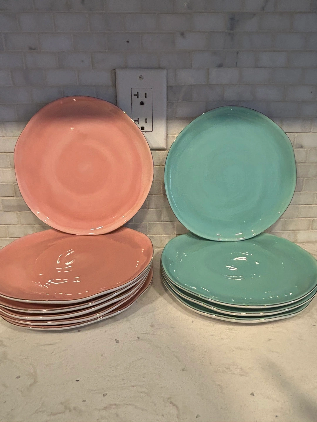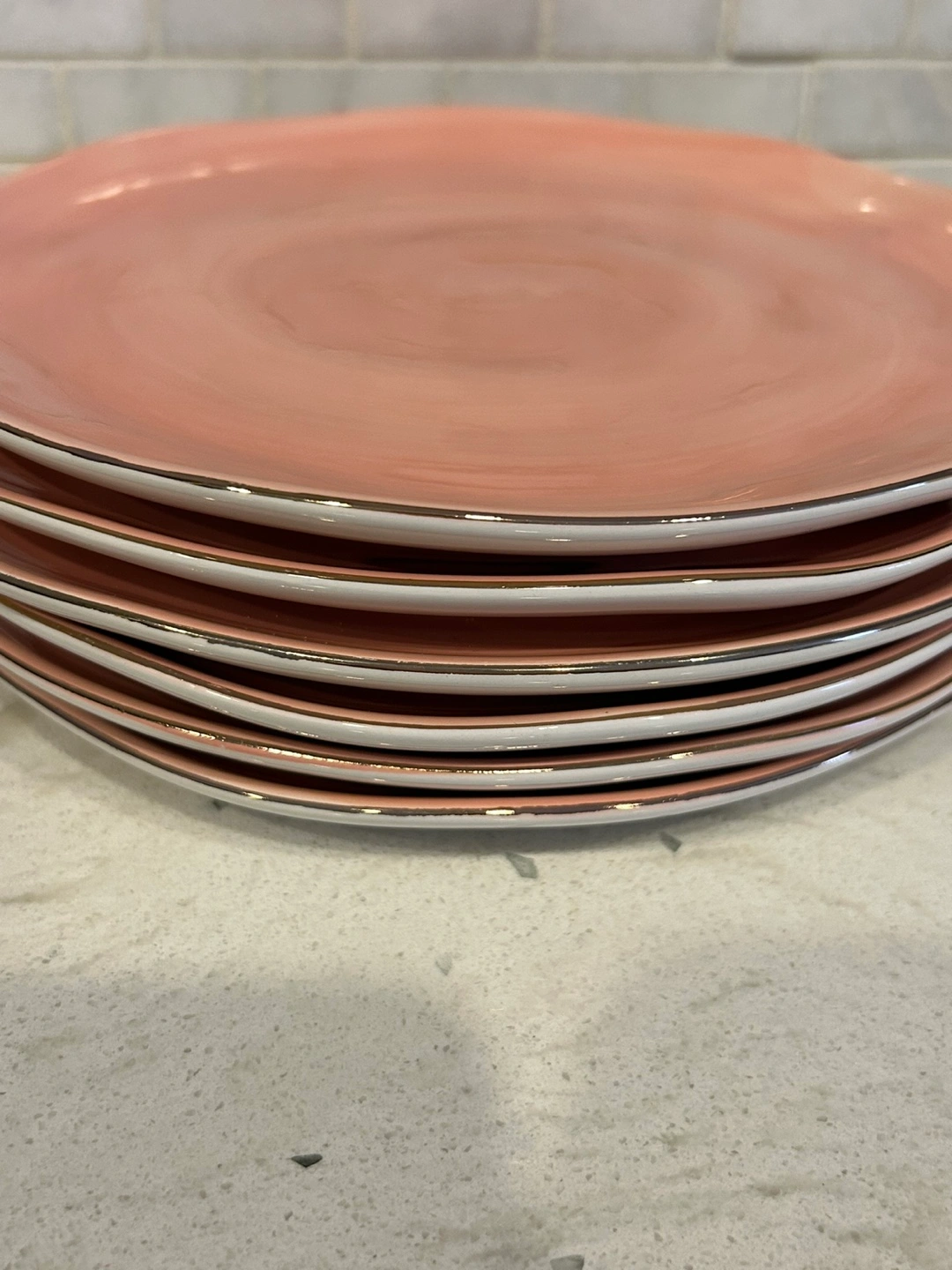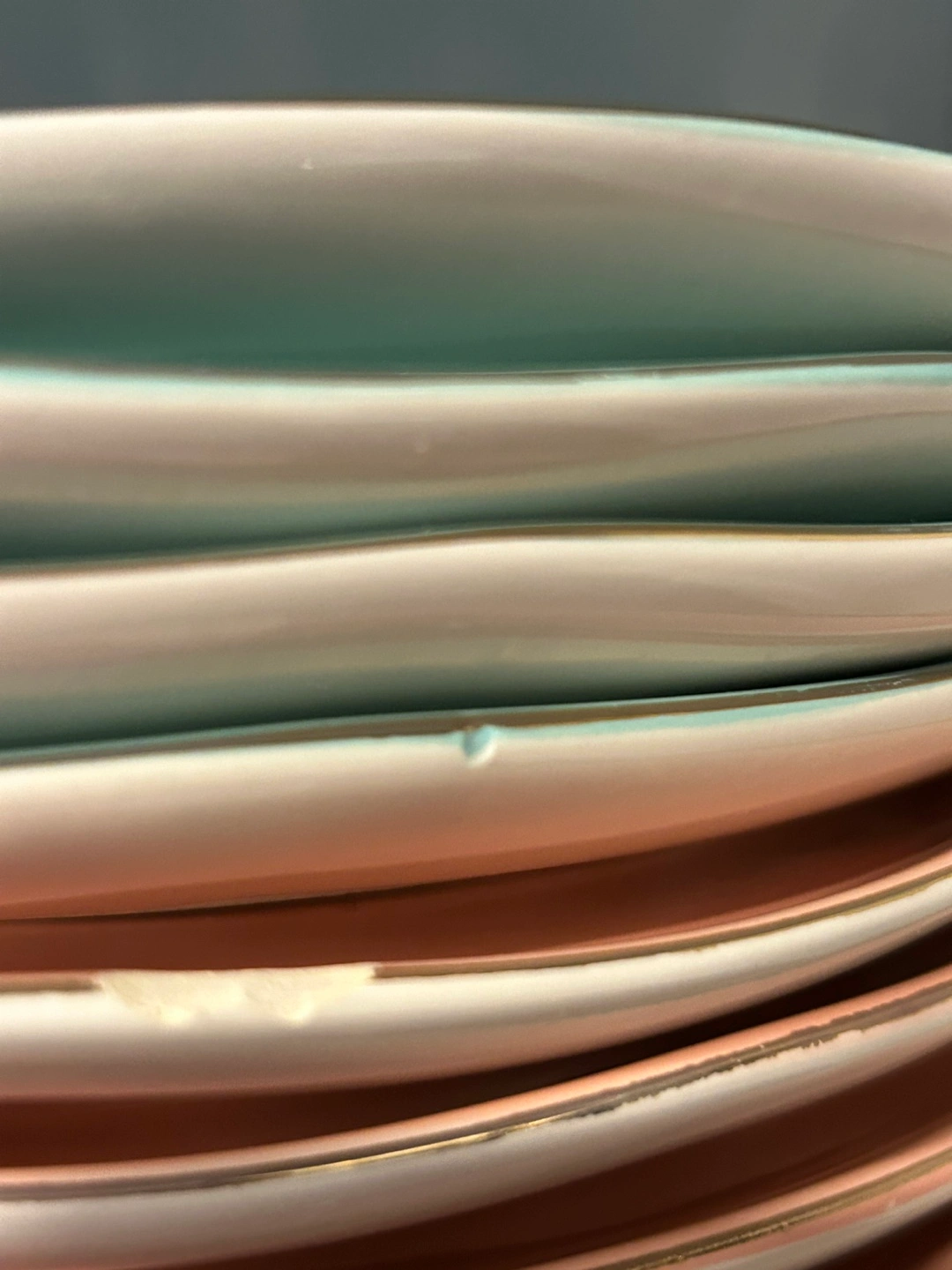 10 beautiful dinner plates. Six blush pink and four teal. Gold-trimmed edges. Slight chip on one pink and one teal plate (as seen in the photos).