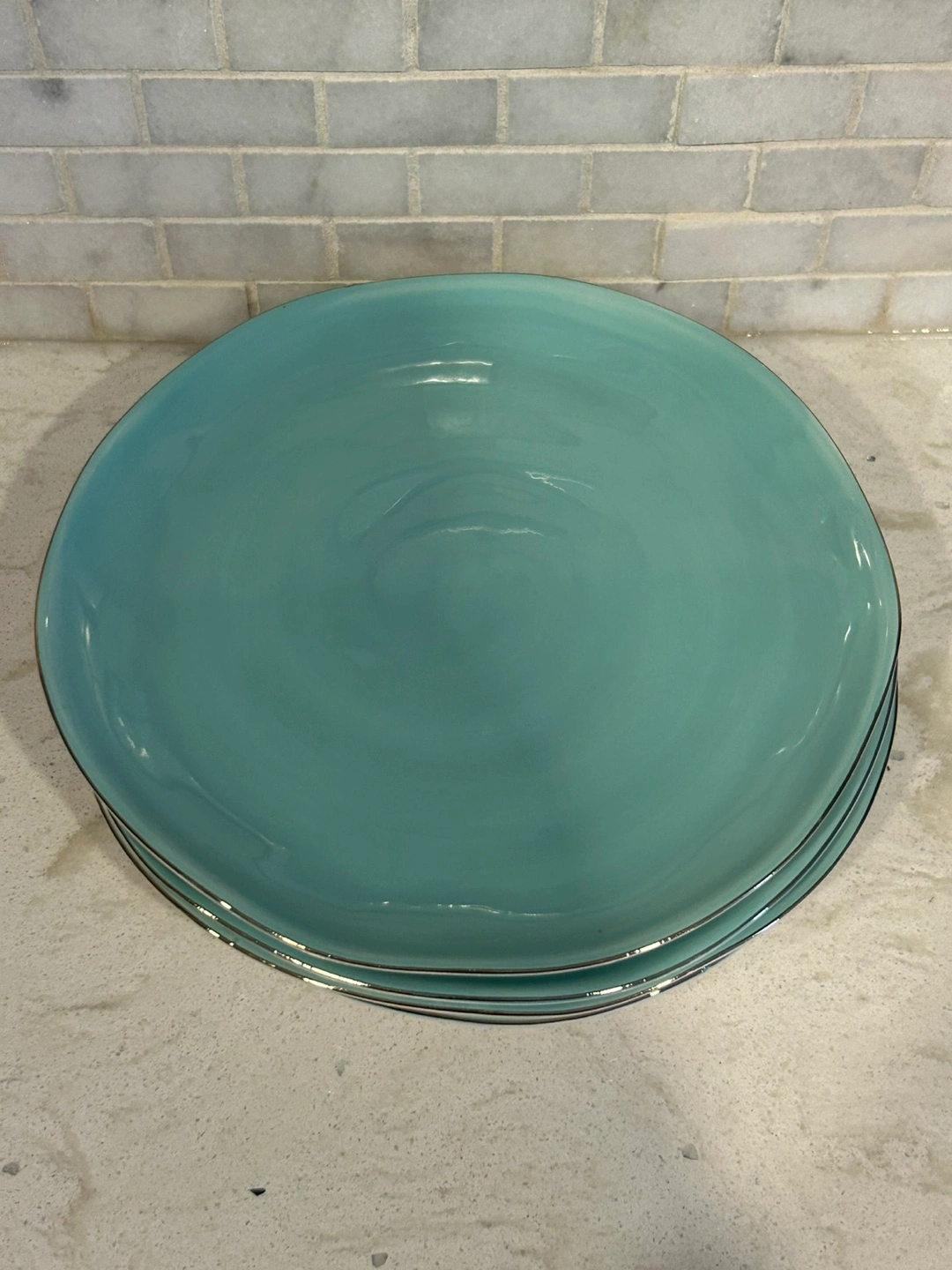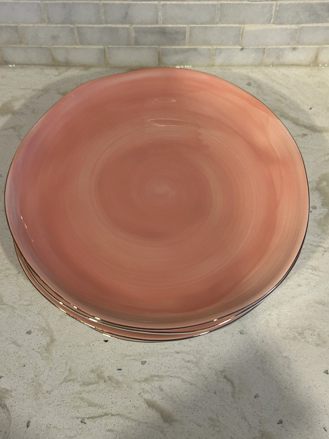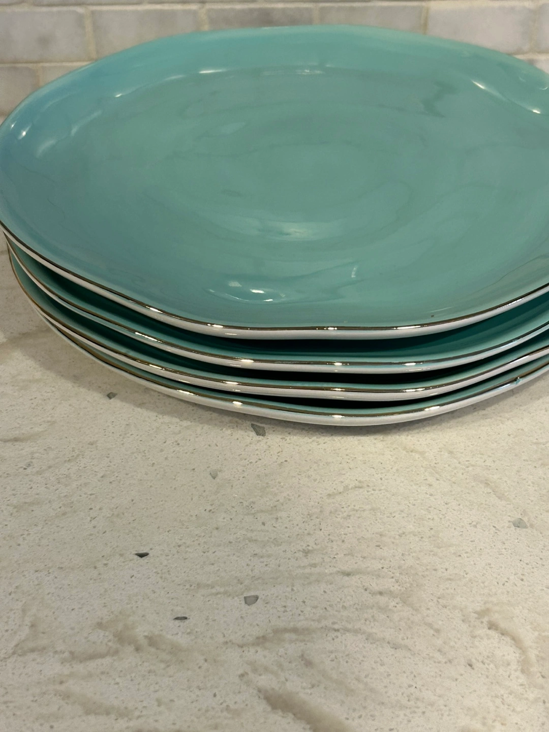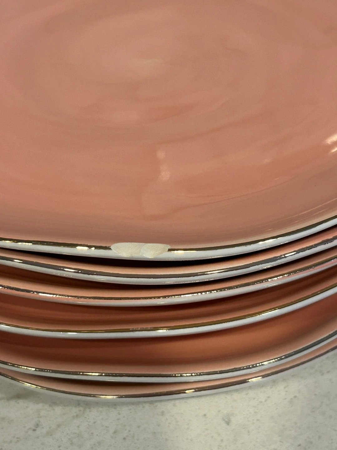 10 beautiful dinner plates. Six blush pink and four teal. Gold-trimmed edges. Slight chip on one pink and one teal plate (as seen in the photos).