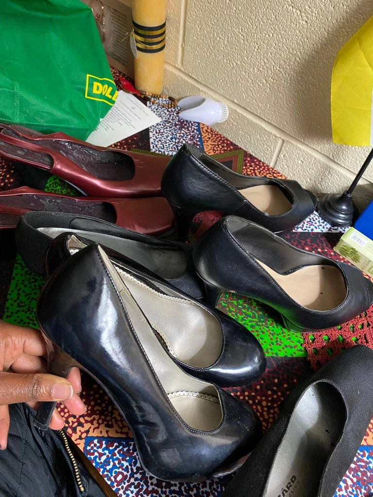 79Four pairs of women's black heels. Various styles and heel heights. Includes two pairs of Nygard Collection shoes.