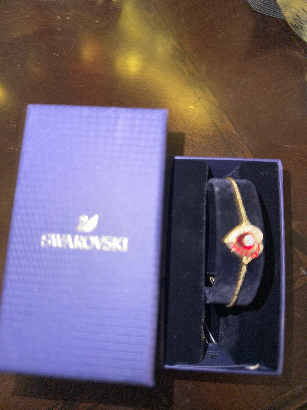 Beautiful Swarovski bracelet. Features a red heart charm. Gold-toned chain. Comes in original box.adjustable !
