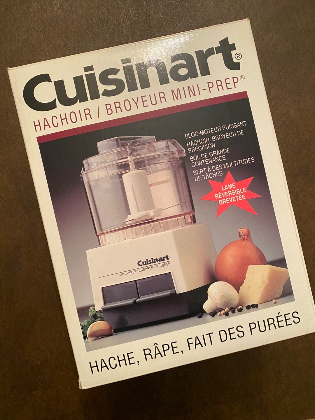 Vintage Cuisinart Mini-Prep food processor. Compact design. Powerful motor. Includes reversible blade. Great for chopping, grinding, and pureeing.