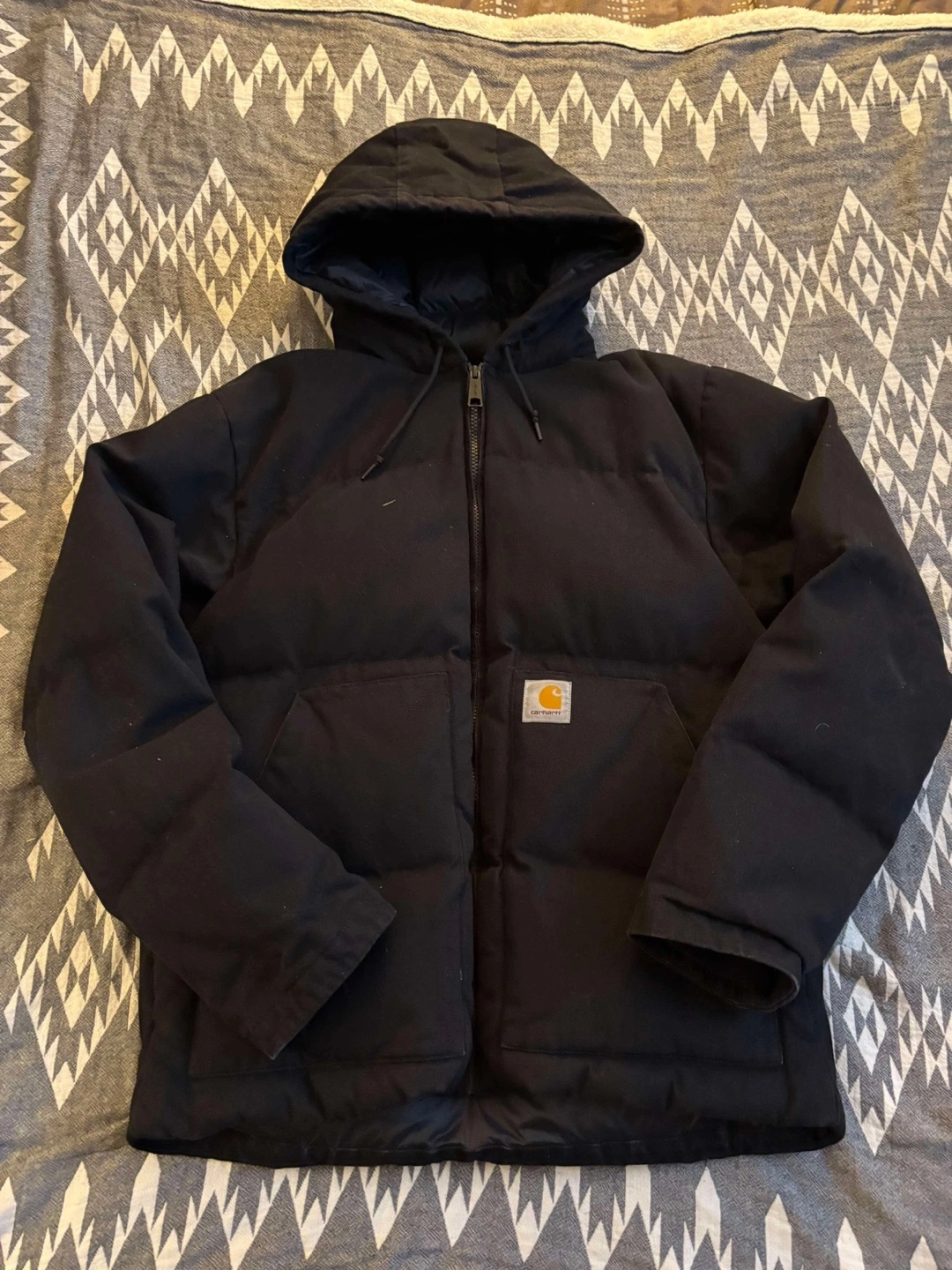 Black puffer jacket. Features a hood and zip closure.