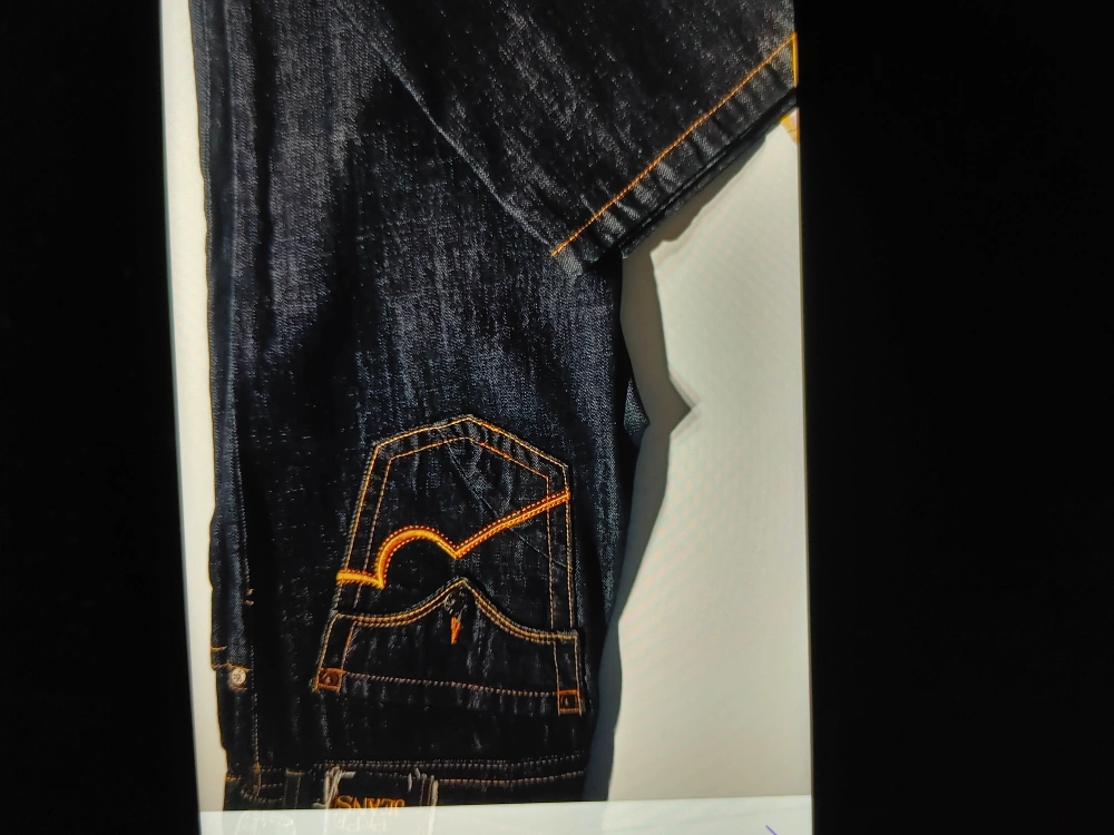 31Dark wash denim jeans. Features orange stitching accents. Men's. Size not visible.