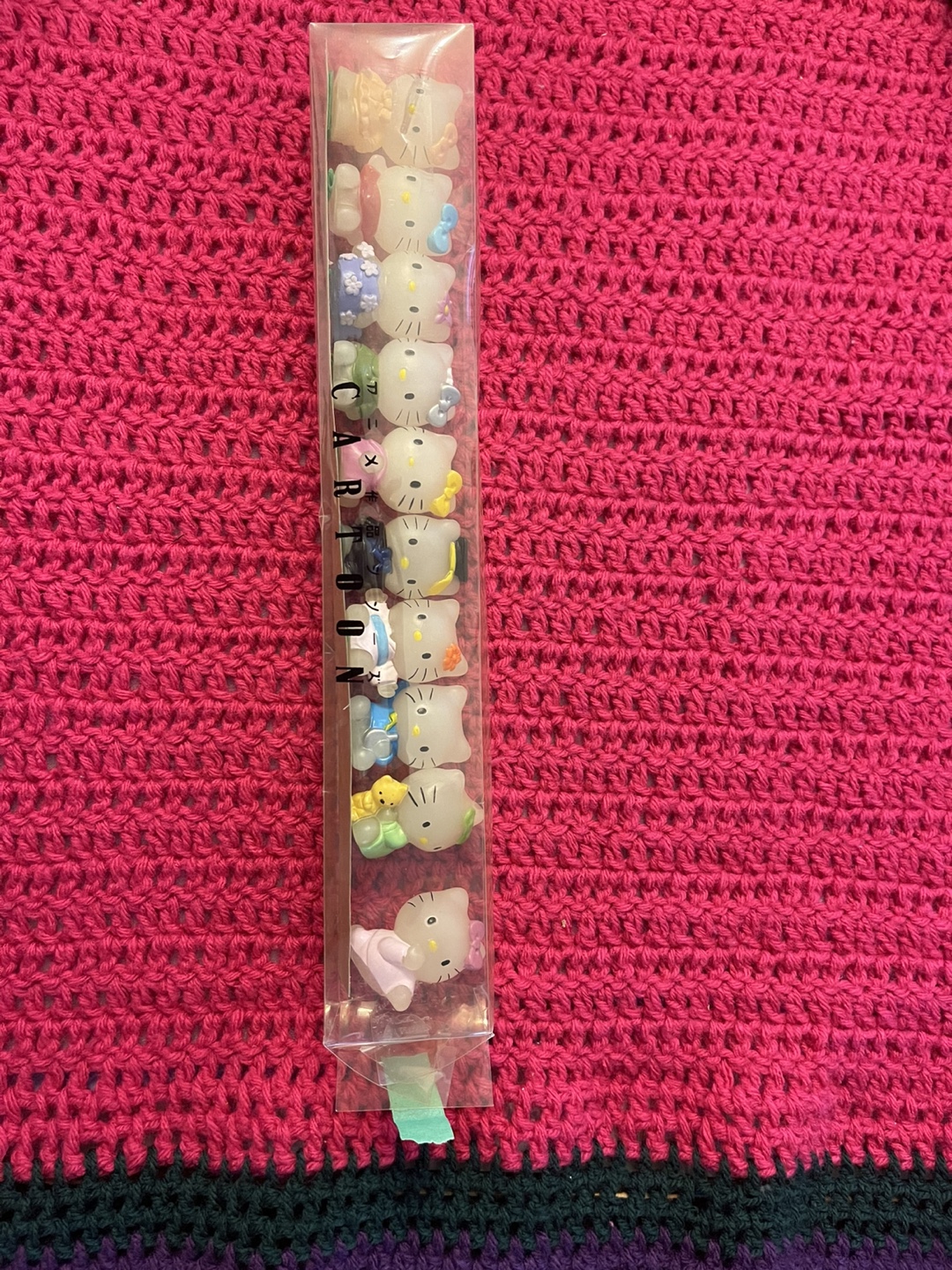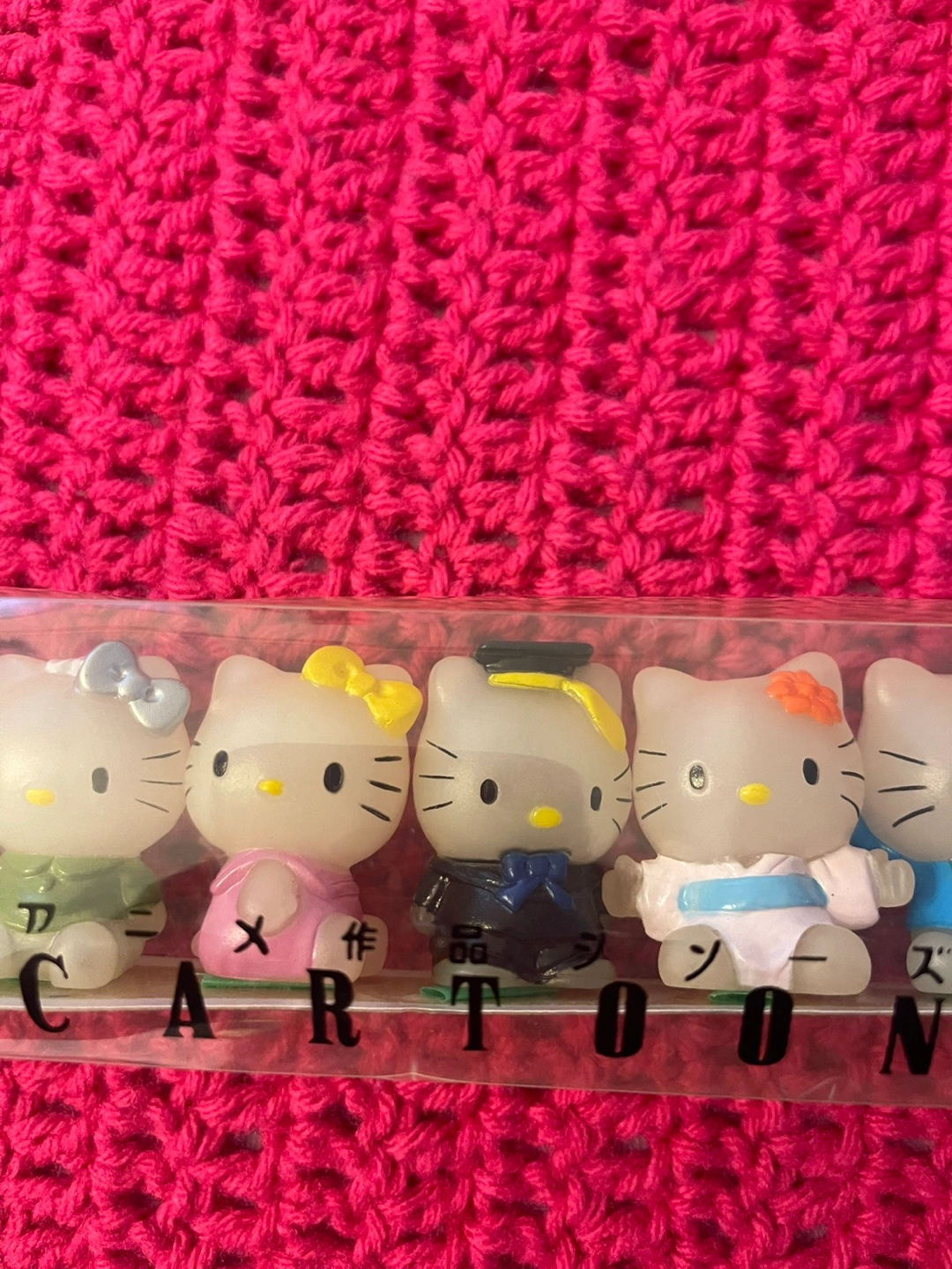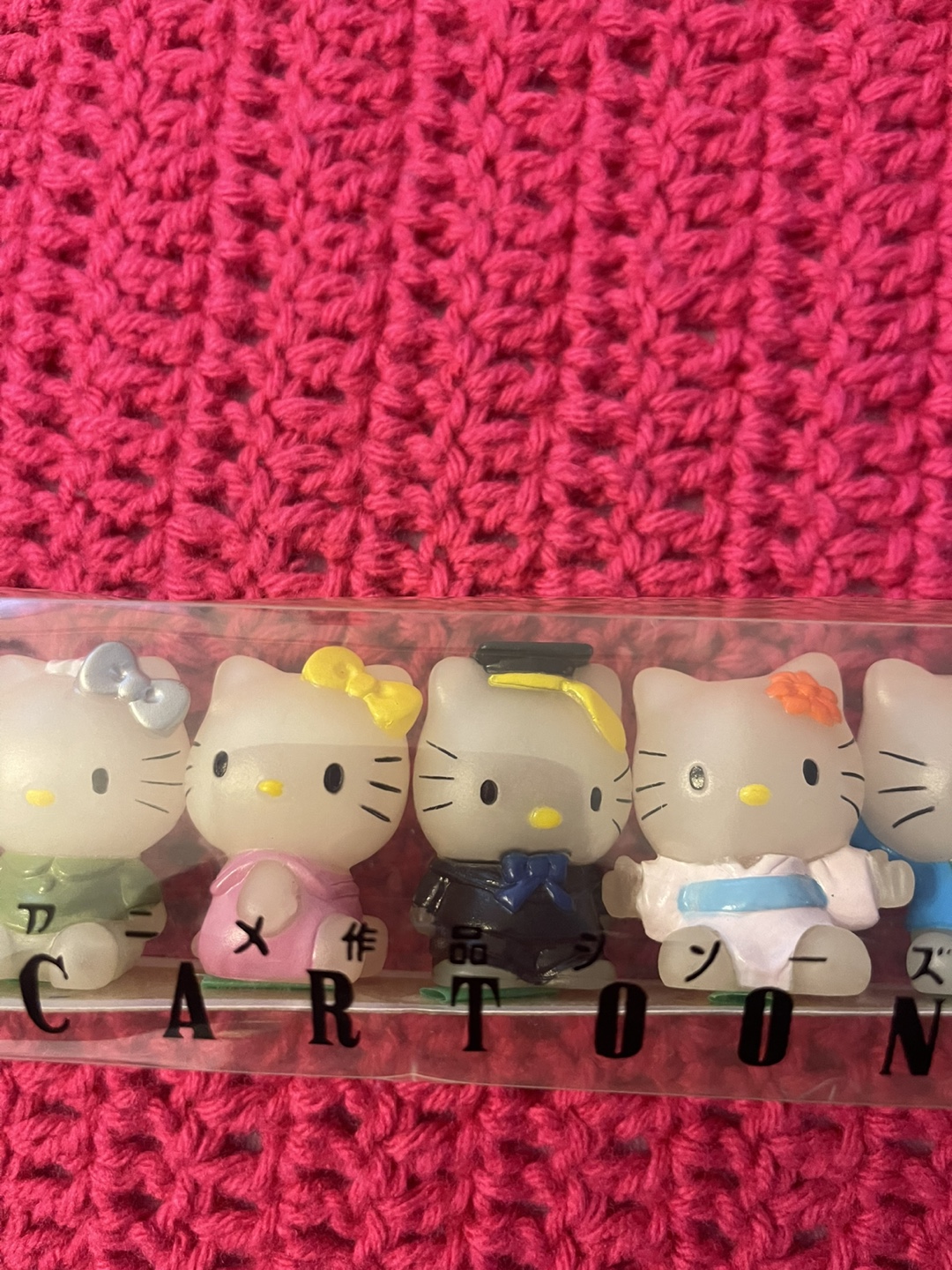 Collection of eight miniature Hello Kitty figurines. Each figurine features Hello Kitty in a different outfit. Packaged in a clear plastic case.