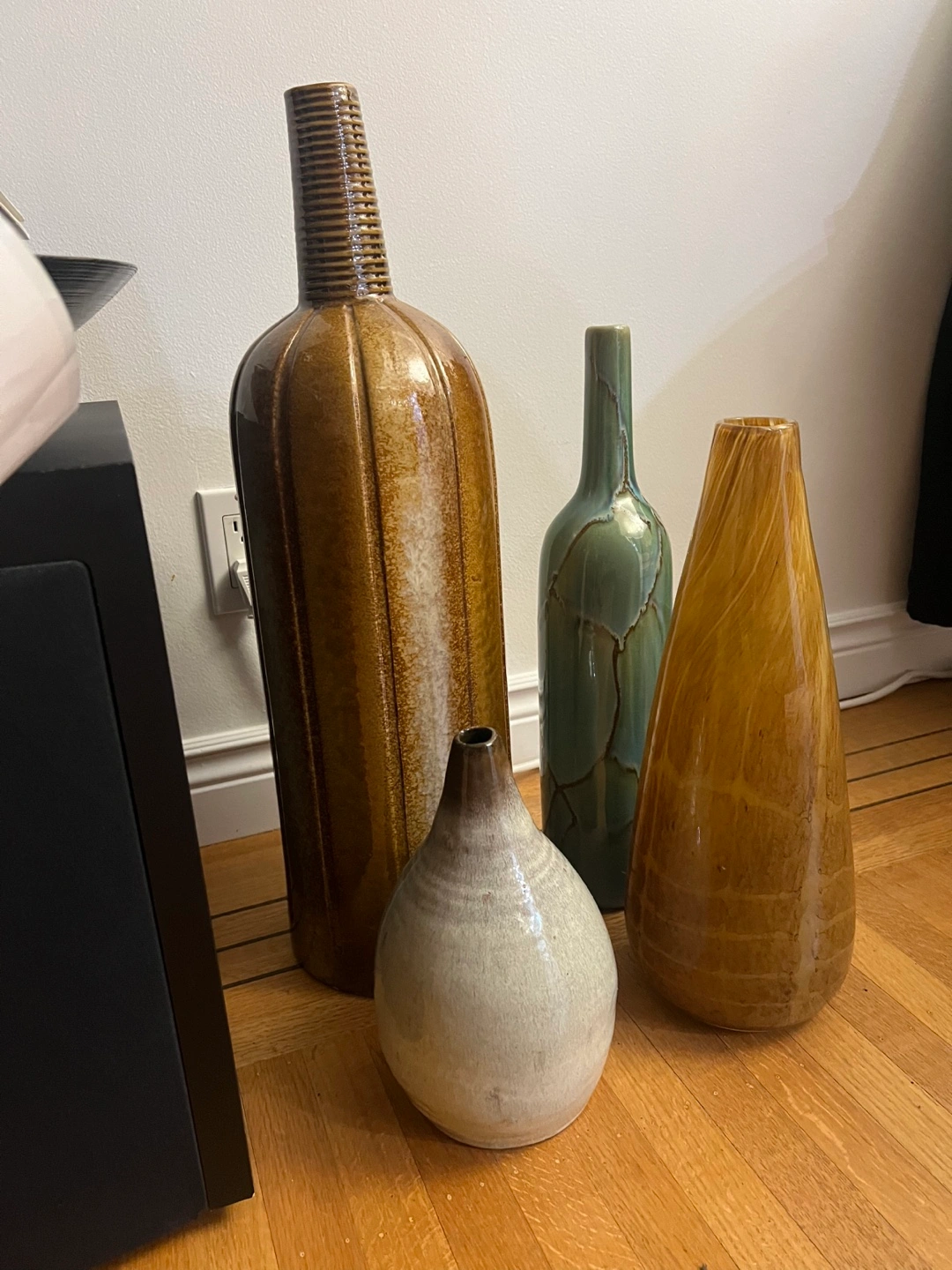 Four unique vases, varying in size, colour and material. Great for home decor. Set includes a tall brown ceramic vase, a teal marbled ceramic vase, a smaller light grey ceramic vase and a tall amber glass vase.