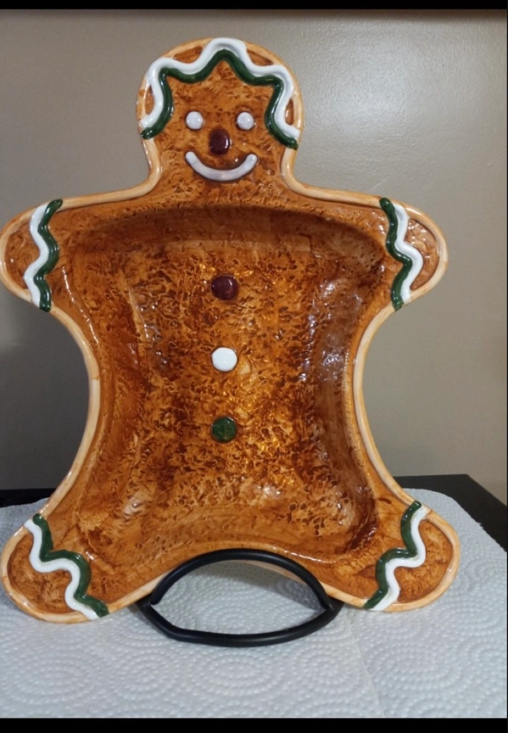 15Ceramic gingerbread man shaped plate.Features a brown glaze and green and white icing details. Includes a black metal stand.