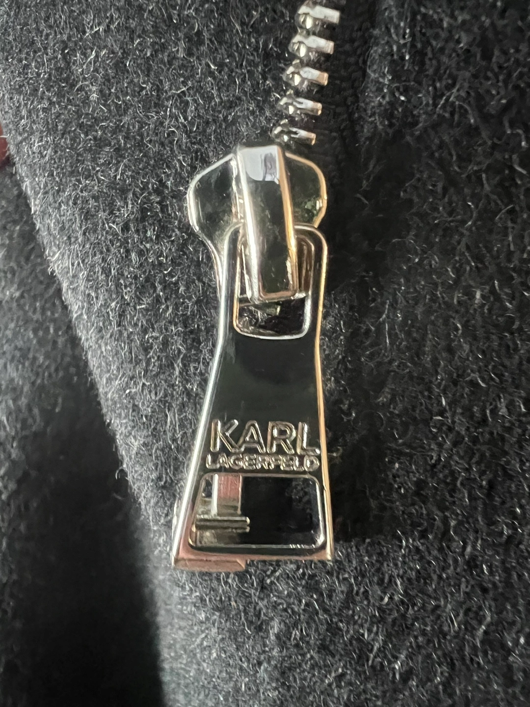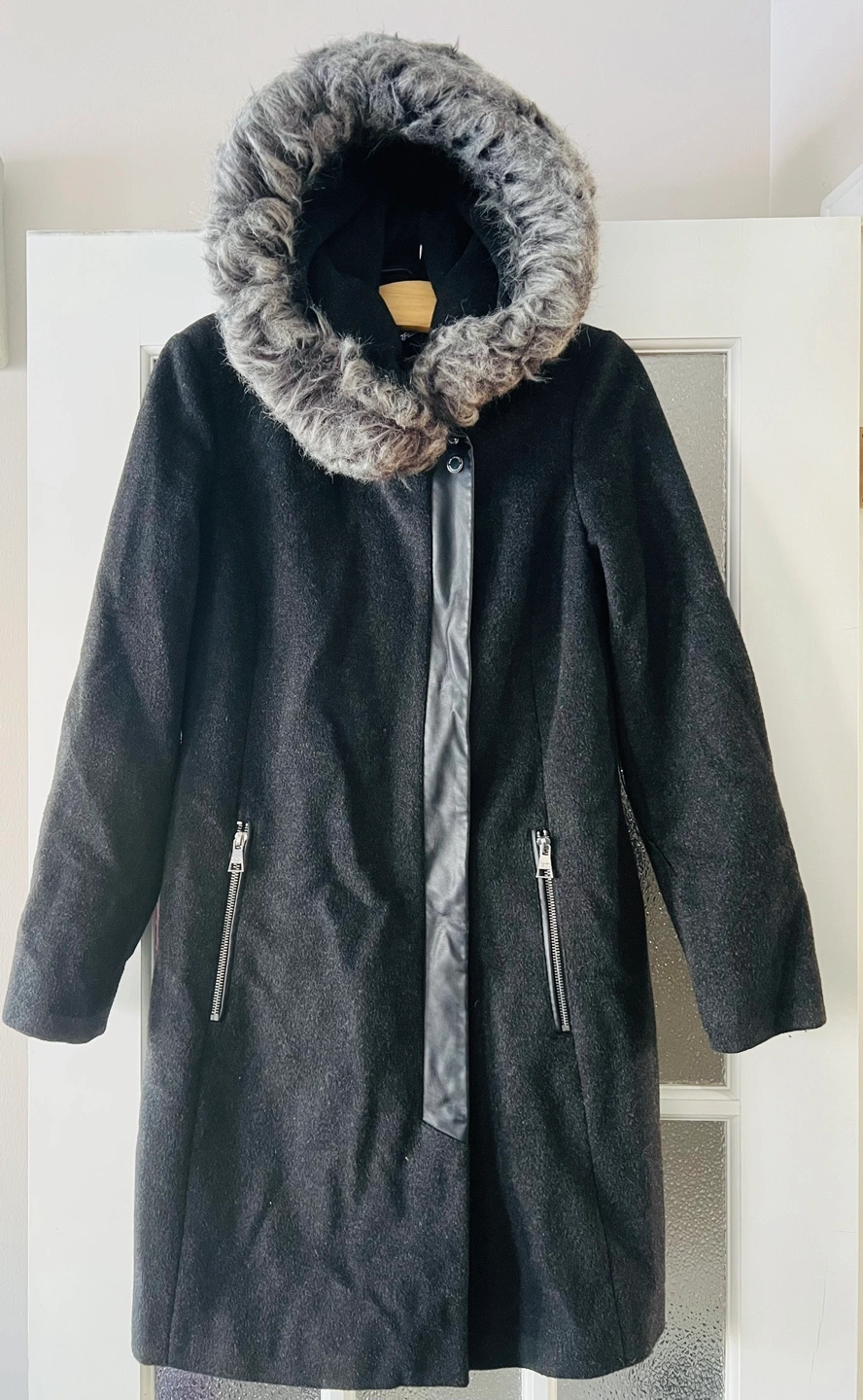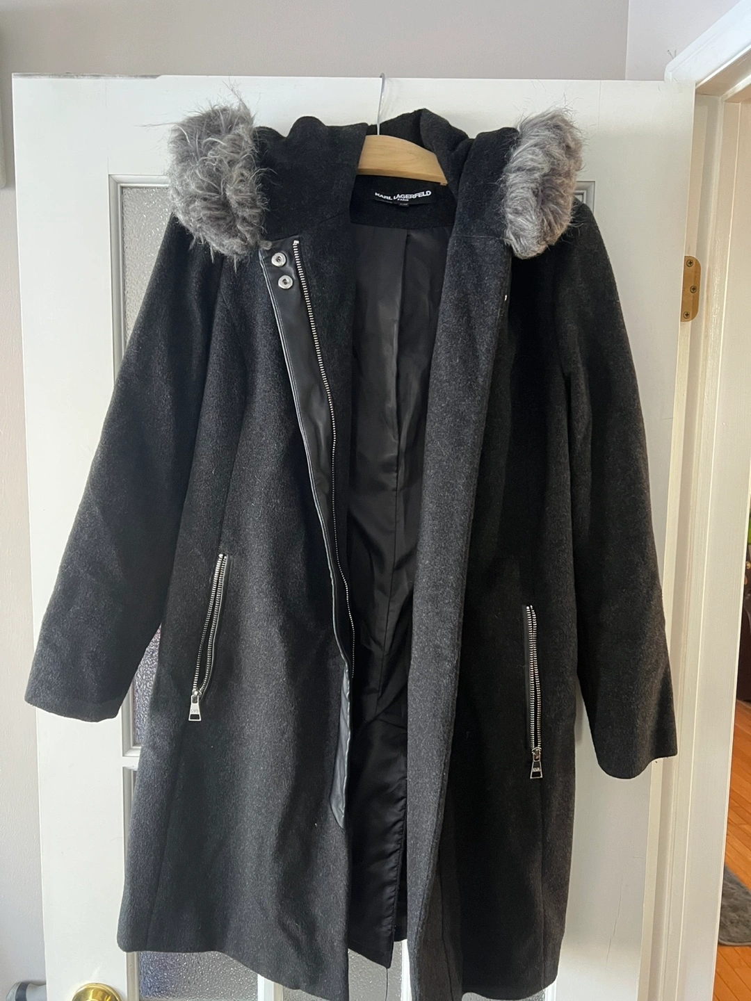 Karl Lagerfeld Paris Women's Dark Gray Wool Coat Jacket Size XS, with Faux Fur Trim on hood. Condion: Gently used, no stains, no rip, all zippers and button closures work perfectly Material: Wool blend Jacket/Coat length: mid-length Closure: zip Lining: polyester Colour: Gray Fit: regular Accents: faux fur trim on hood, silver zippered outer pockets and one inside pocket Retail MSRP: $380.00 ***smoke free home