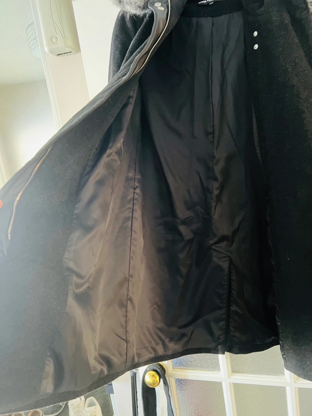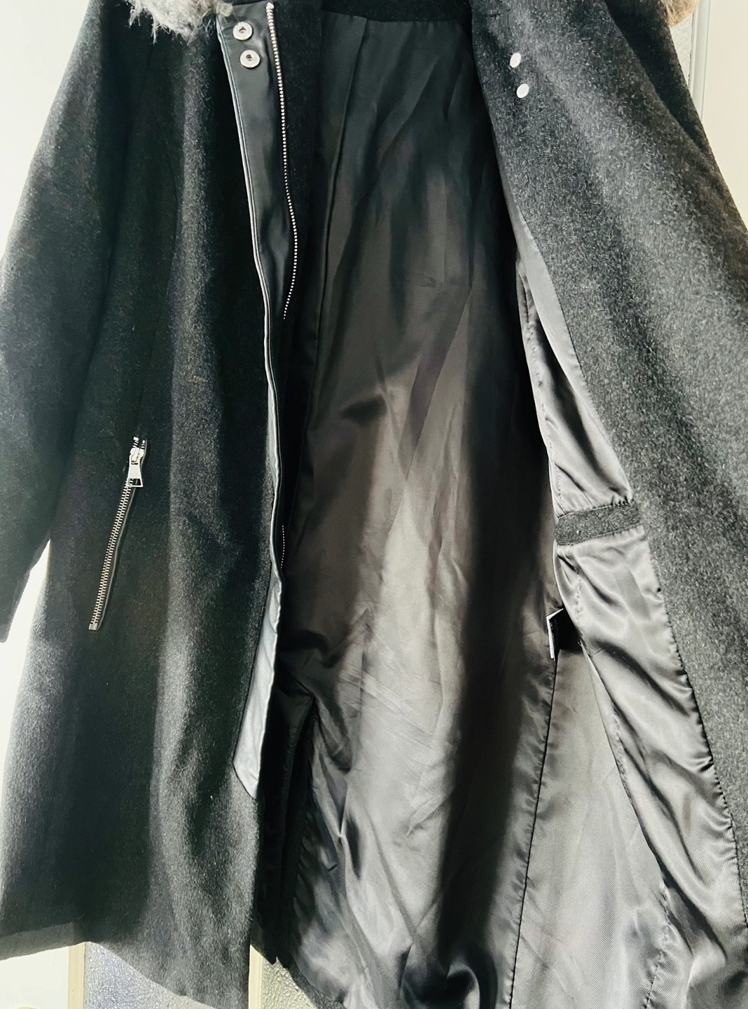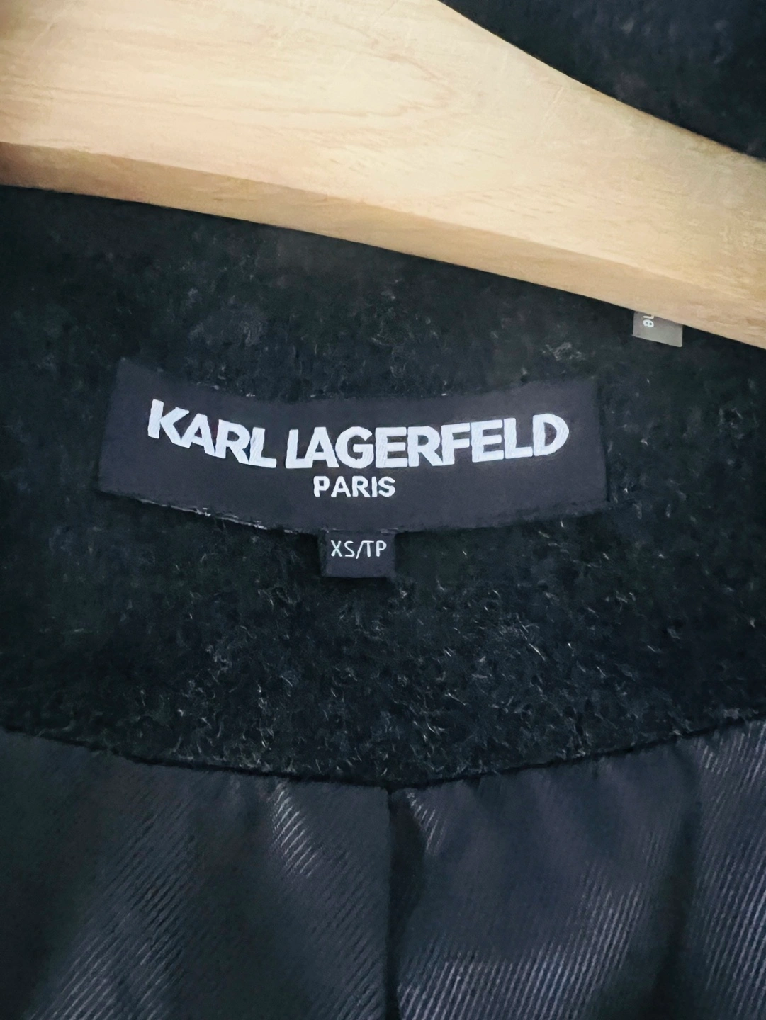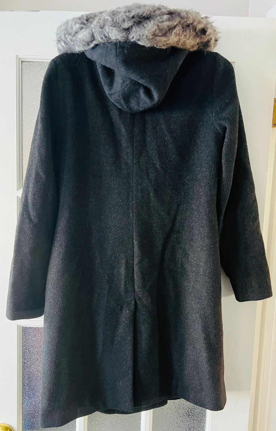 Karl Lagerfeld Paris Women's Dark Gray Wool Coat Jacket Size XS, with Faux Fur Trim on hood. Condion: Gently used, no stains, no rip, all zippers and button closures work perfectly Material: Wool blend Jacket/Coat length: mid-length Closure: zip Lining: polyester Colour: Gray Fit: regular Accents: faux fur trim on hood, silver zippered outer pockets and one inside pocket Retail MSRP: $380.00 ***smoke free home