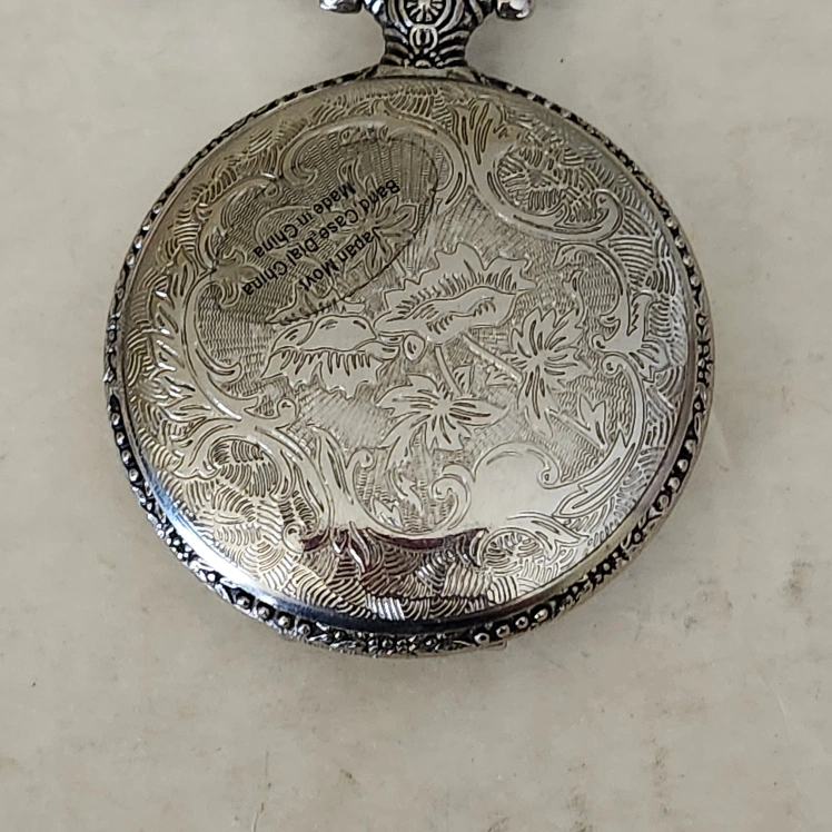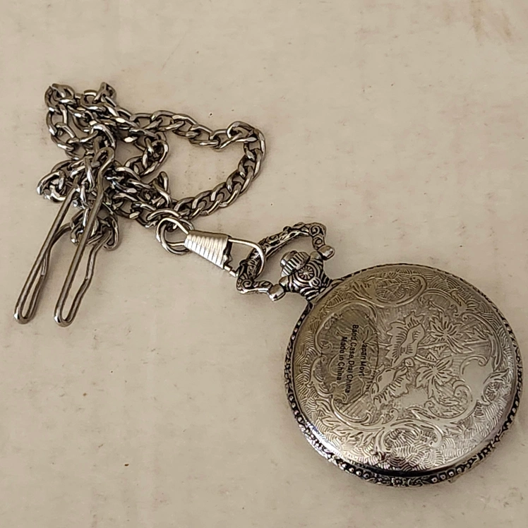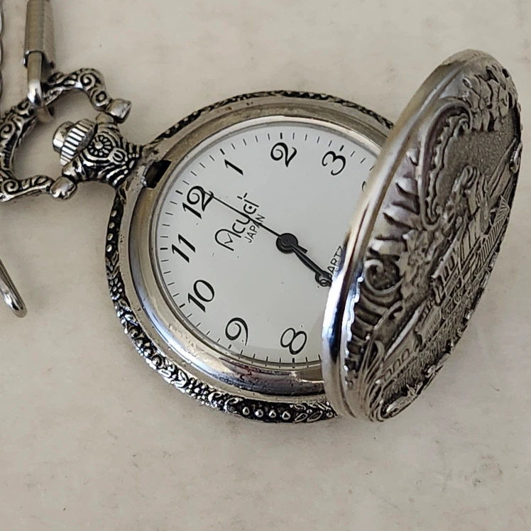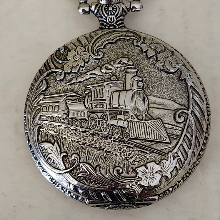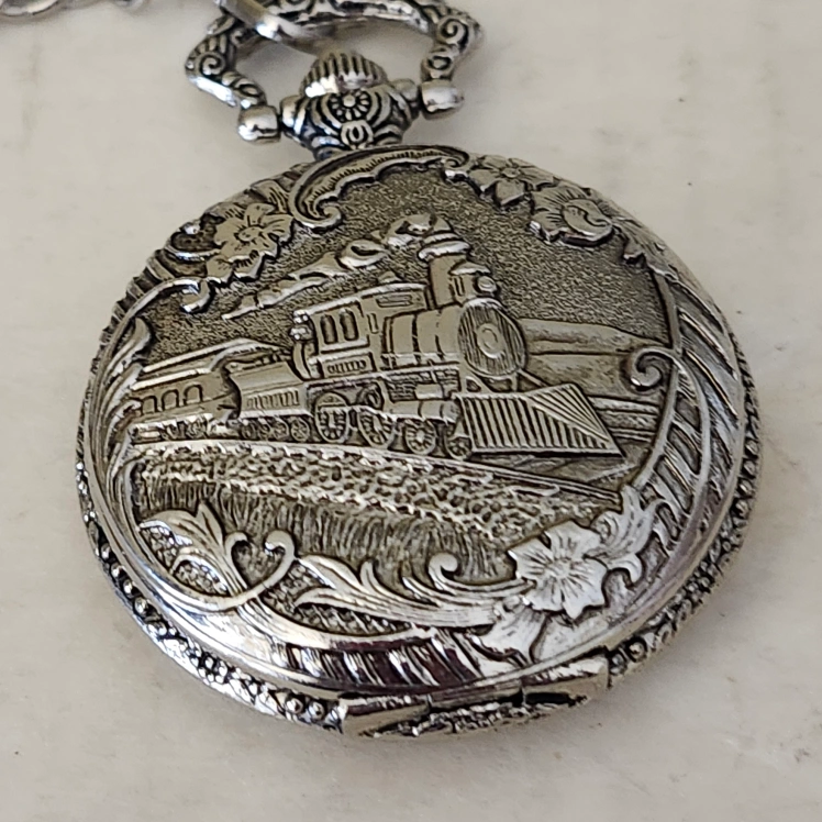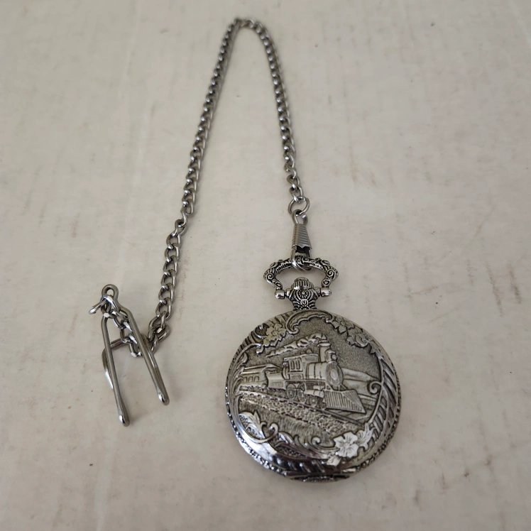 Silver-toned pocket watch. Features an engraved train design on the front and back. Includes a chain. Quartz movement. Pick up.