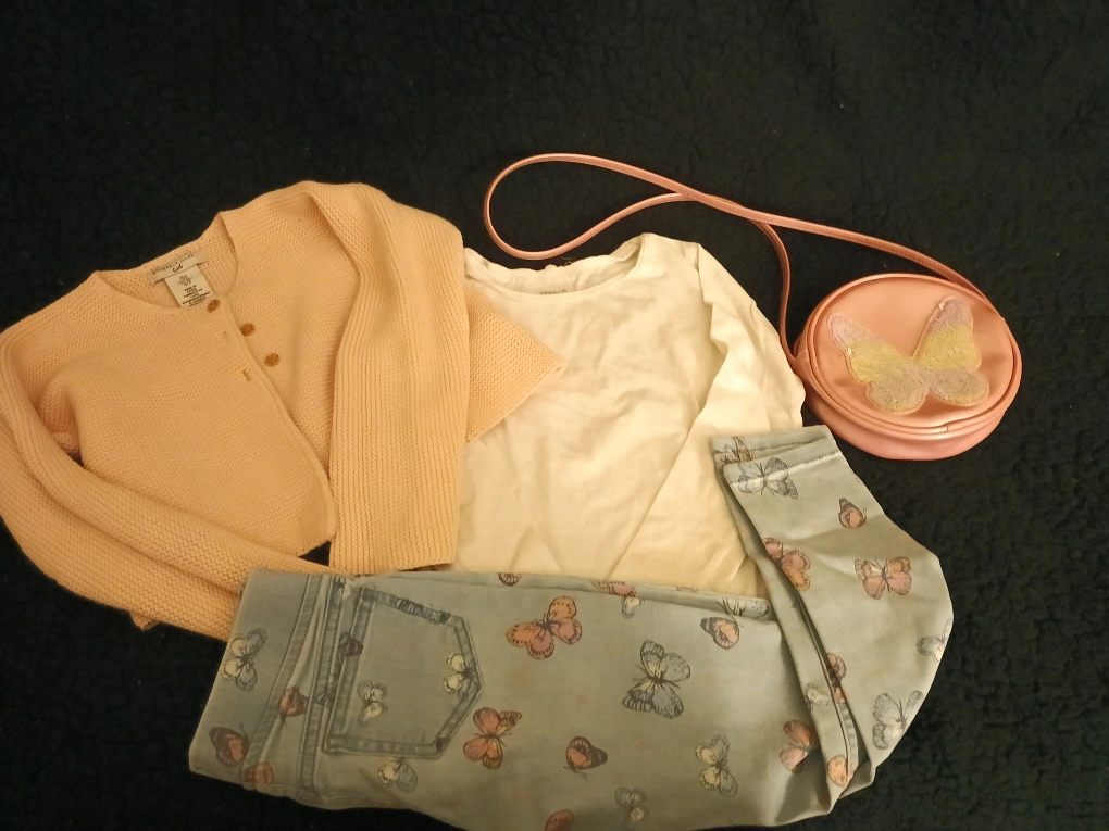 Adorable girls' outfit. Includes a peach-coloured knitted cardigan, a white long-sleeved shirt, light blue jeans with butterfly print, and a small pink crossbody bag. Perfect for spring or summer.