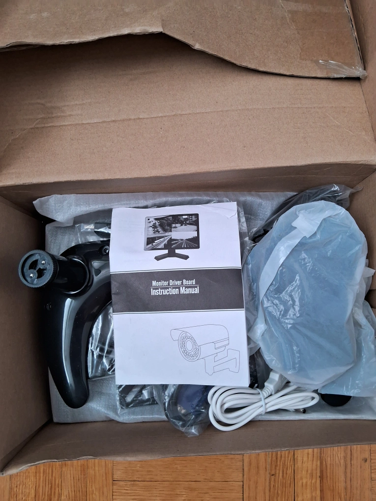 Brand new 7-inch TFT-LED monitor. Includes security camera, power supply, and mounting bracket. Instruction manual included. Perfect for home security.