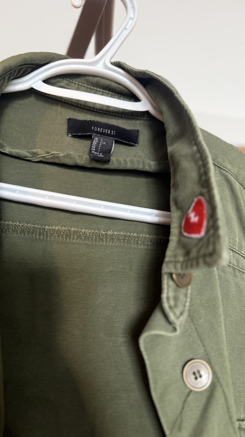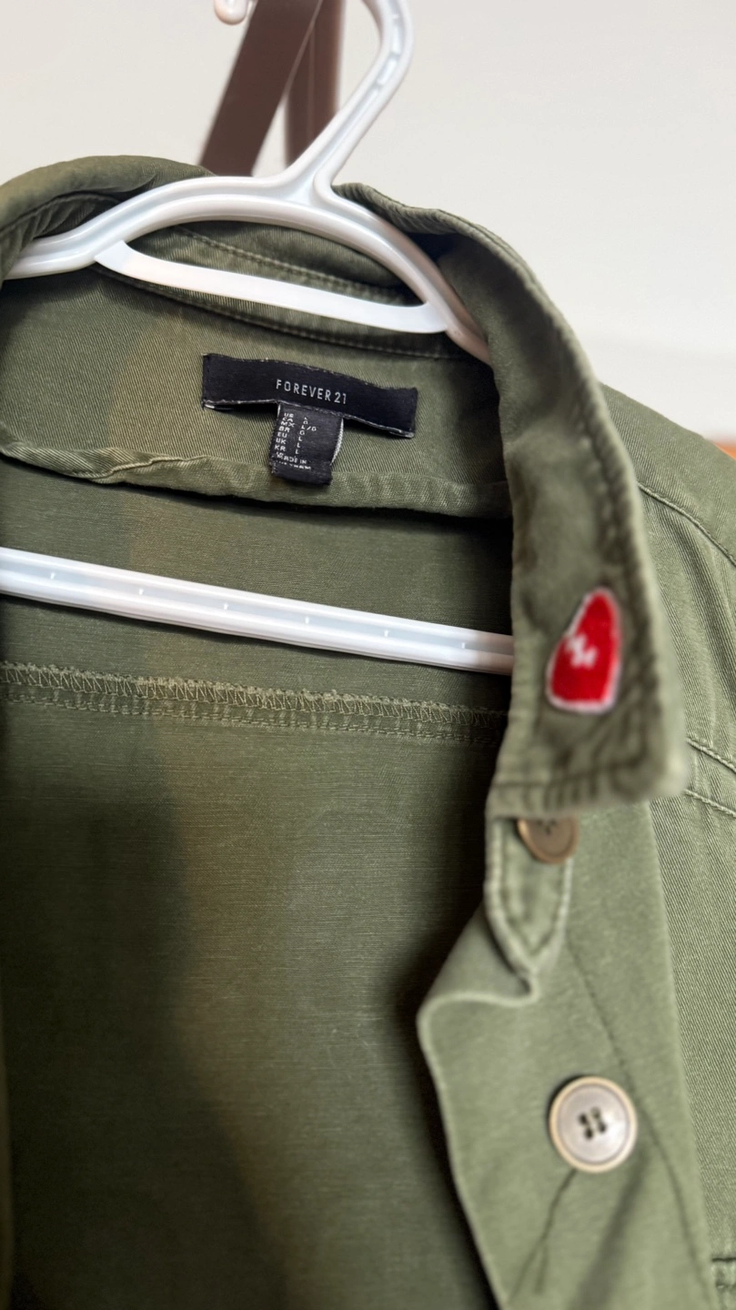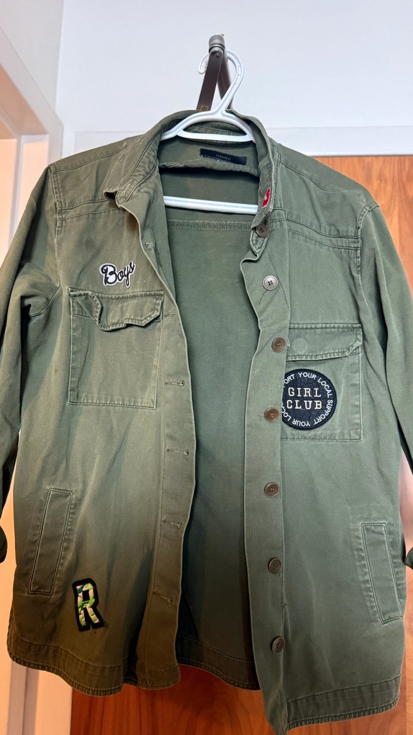 Olive green utility jacket. Multiple embroidered patches. Long sleeves, button closure. Size small.