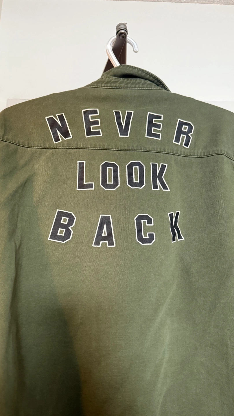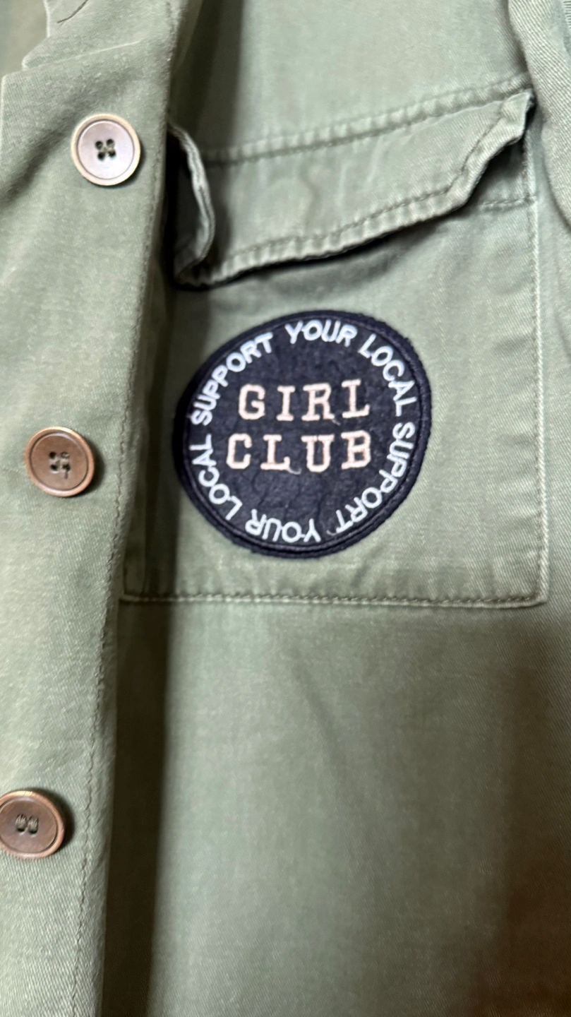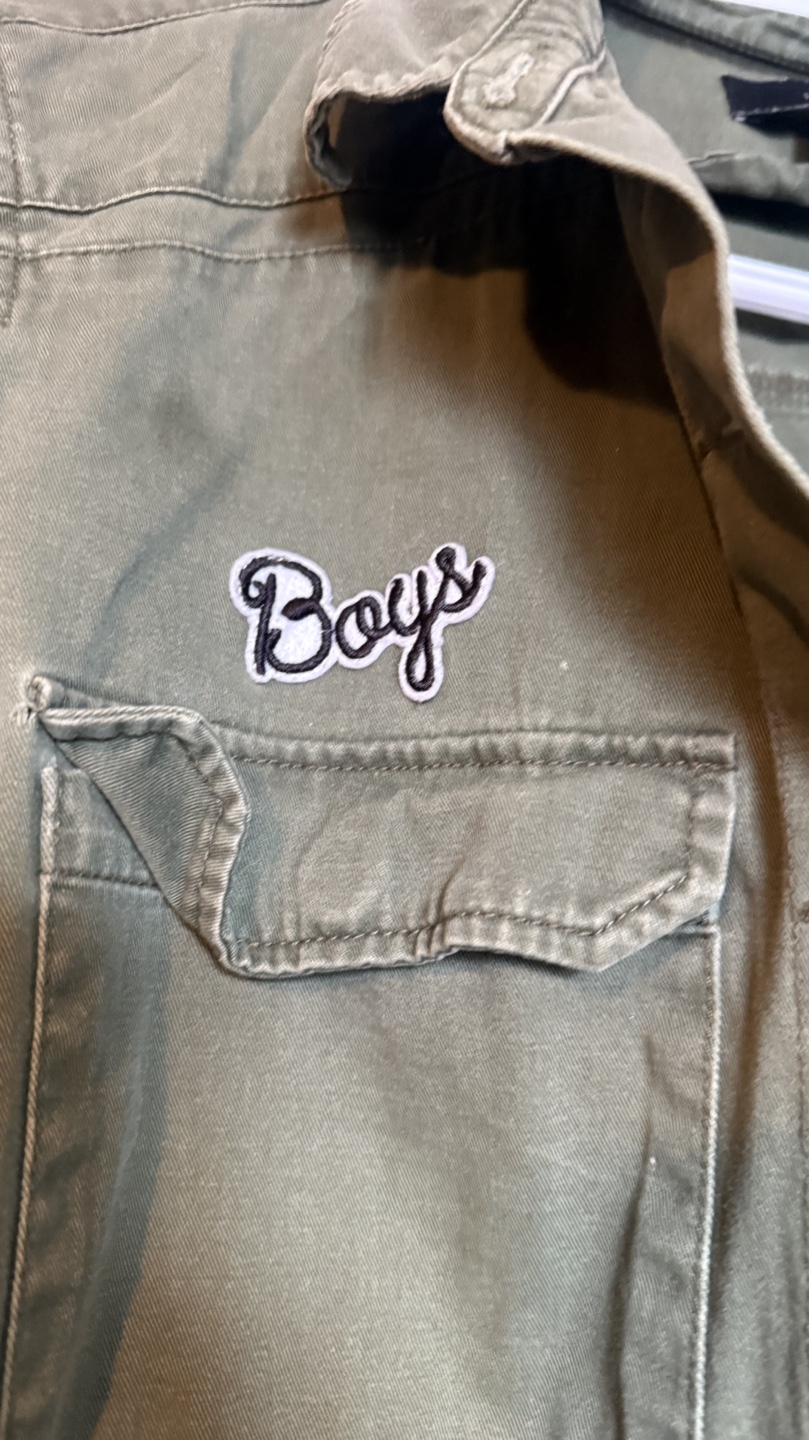 Olive green utility jacket. Multiple embroidered patches. Long sleeves, button closure. Size small.