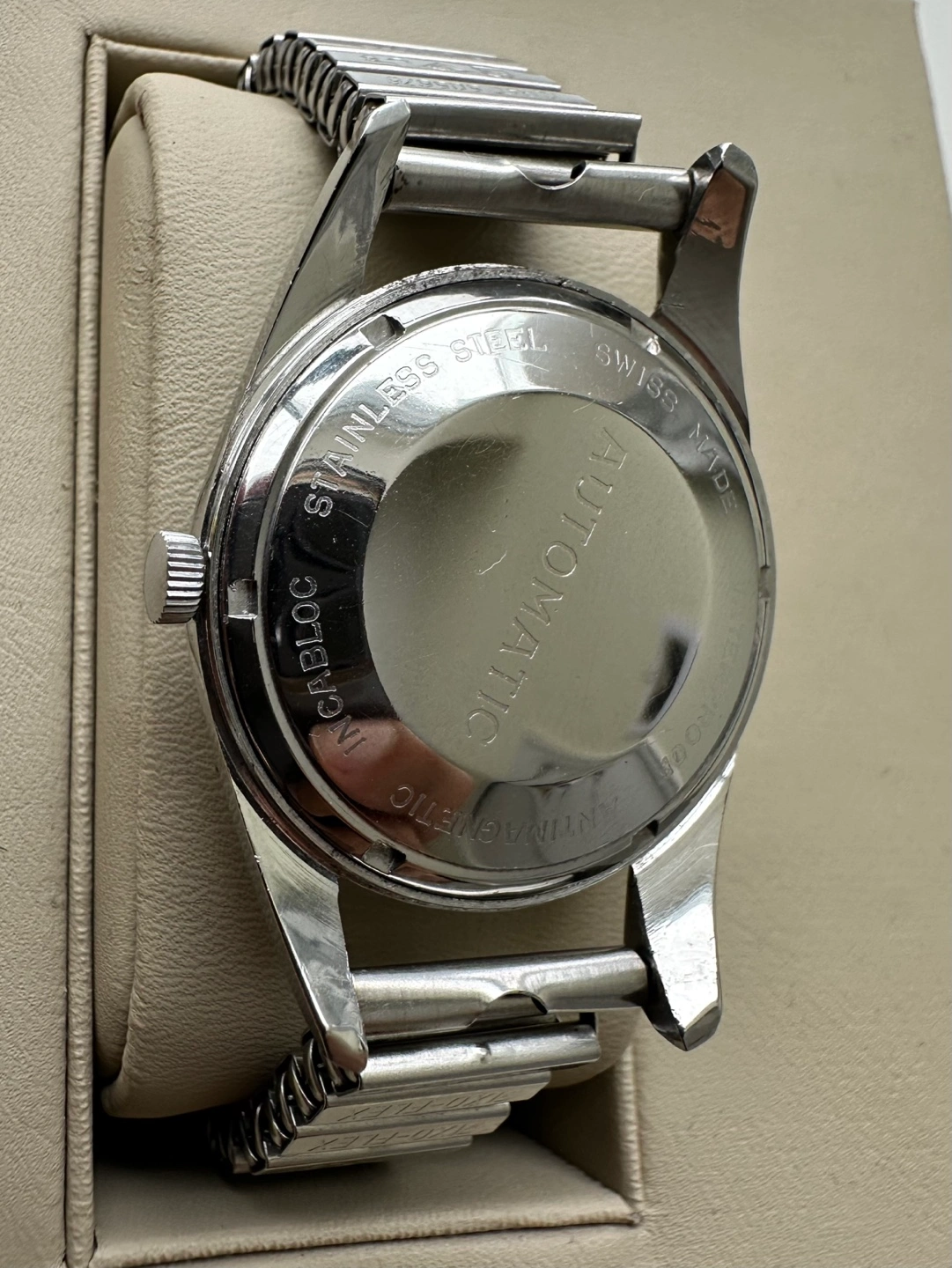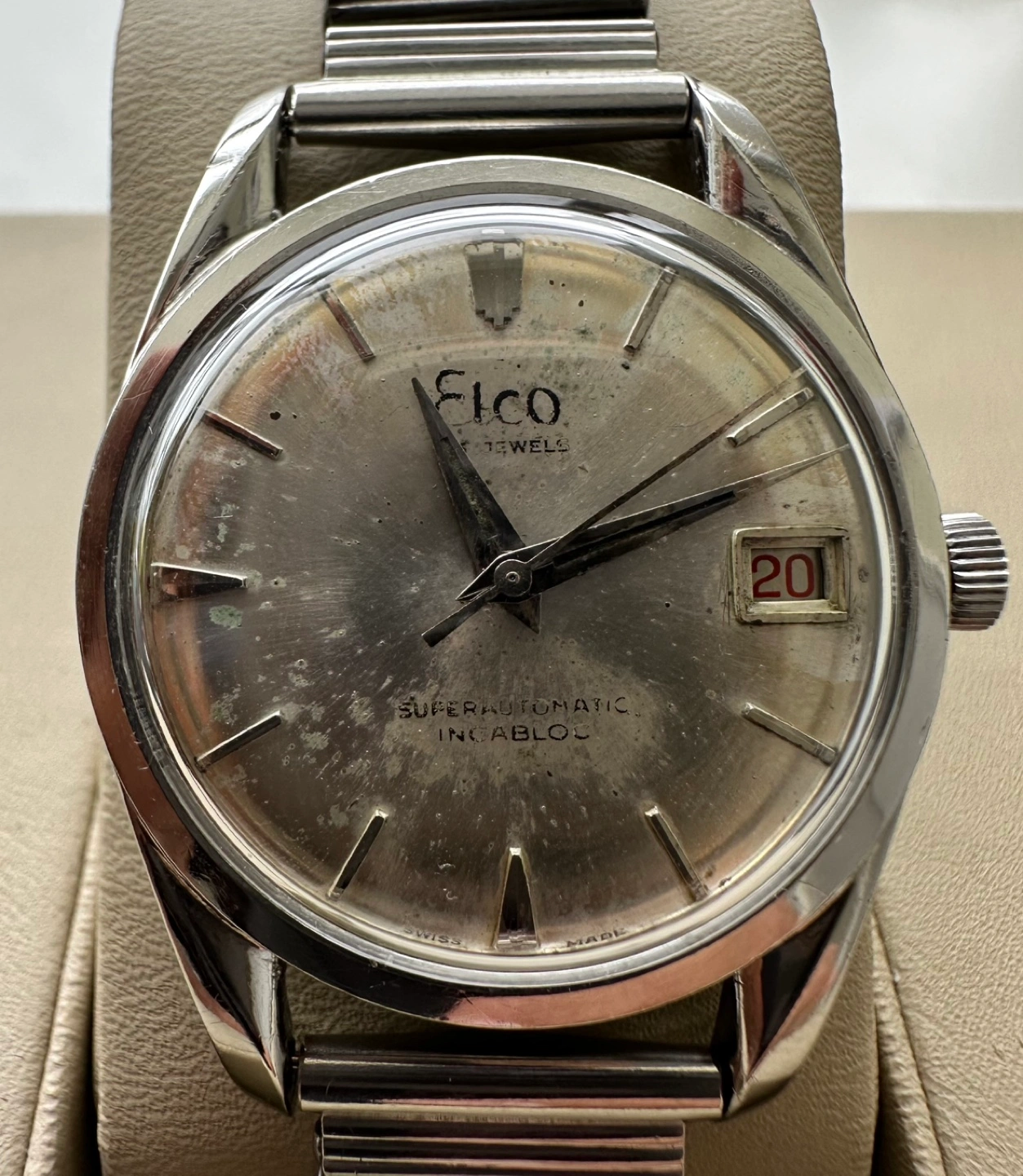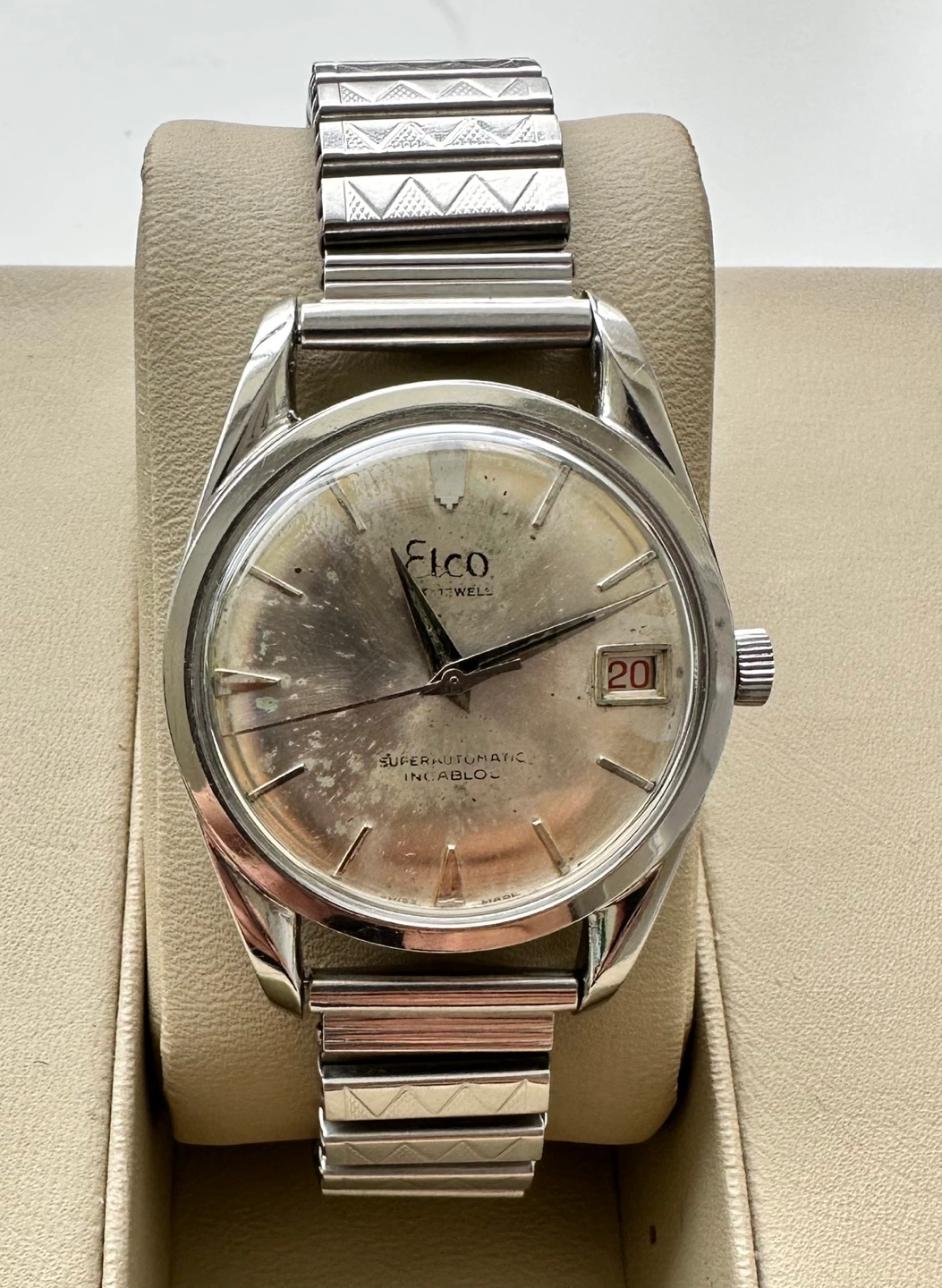 588Swiss Made Elco SUPERAUTOMATIC Watch Polished 33mm silver case and dial with date display Thin case design (10.5mm) Swiss Automatic Movement (AS1701) Incabloc shock resistance system Waterproof Anti-magnetic Full movement service done, regulated for accurate time keeping. New crystal installed for clear view of the dial. Rubber gaskets replaced for improved water resistance. Includes free “Made in Canada” Stainless Steel Fixo-Flex stretch bracelet.