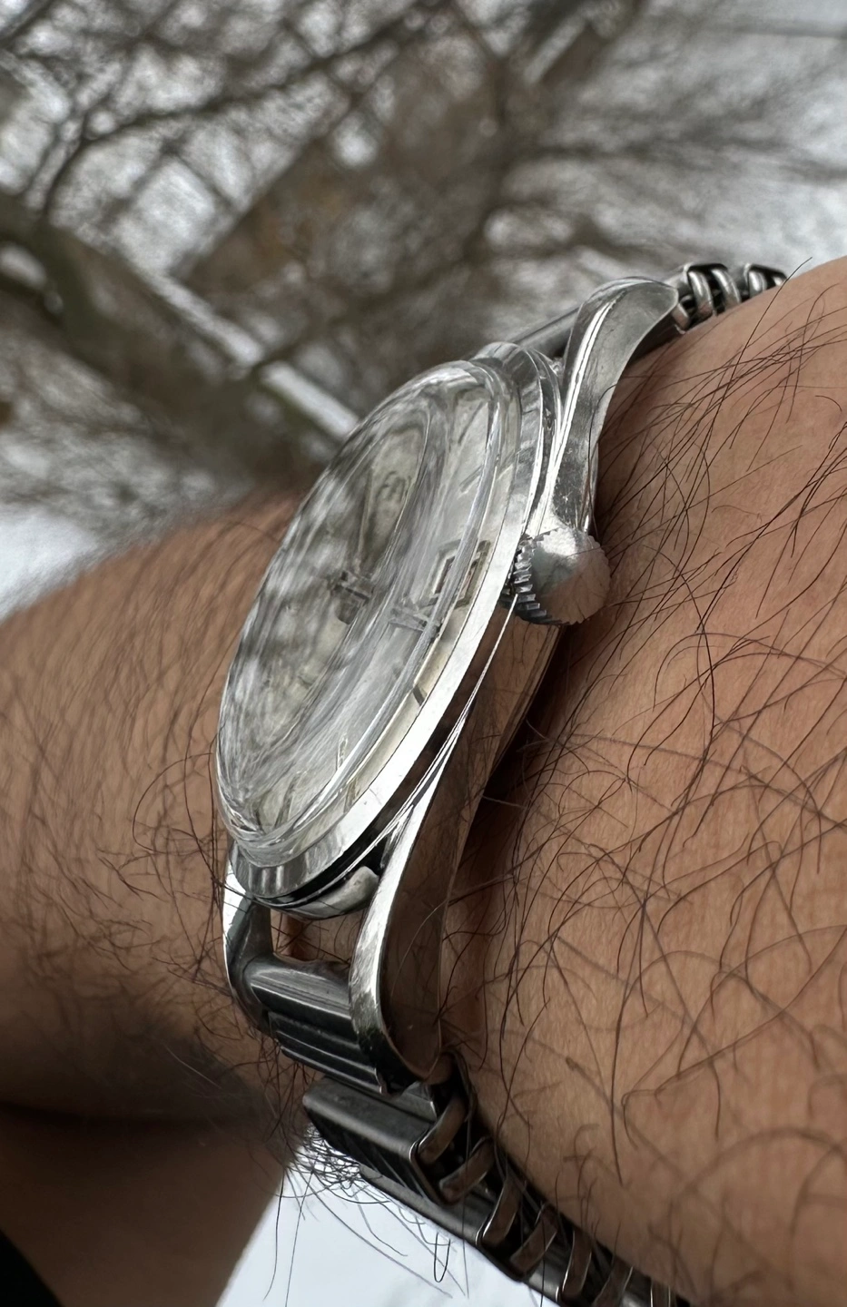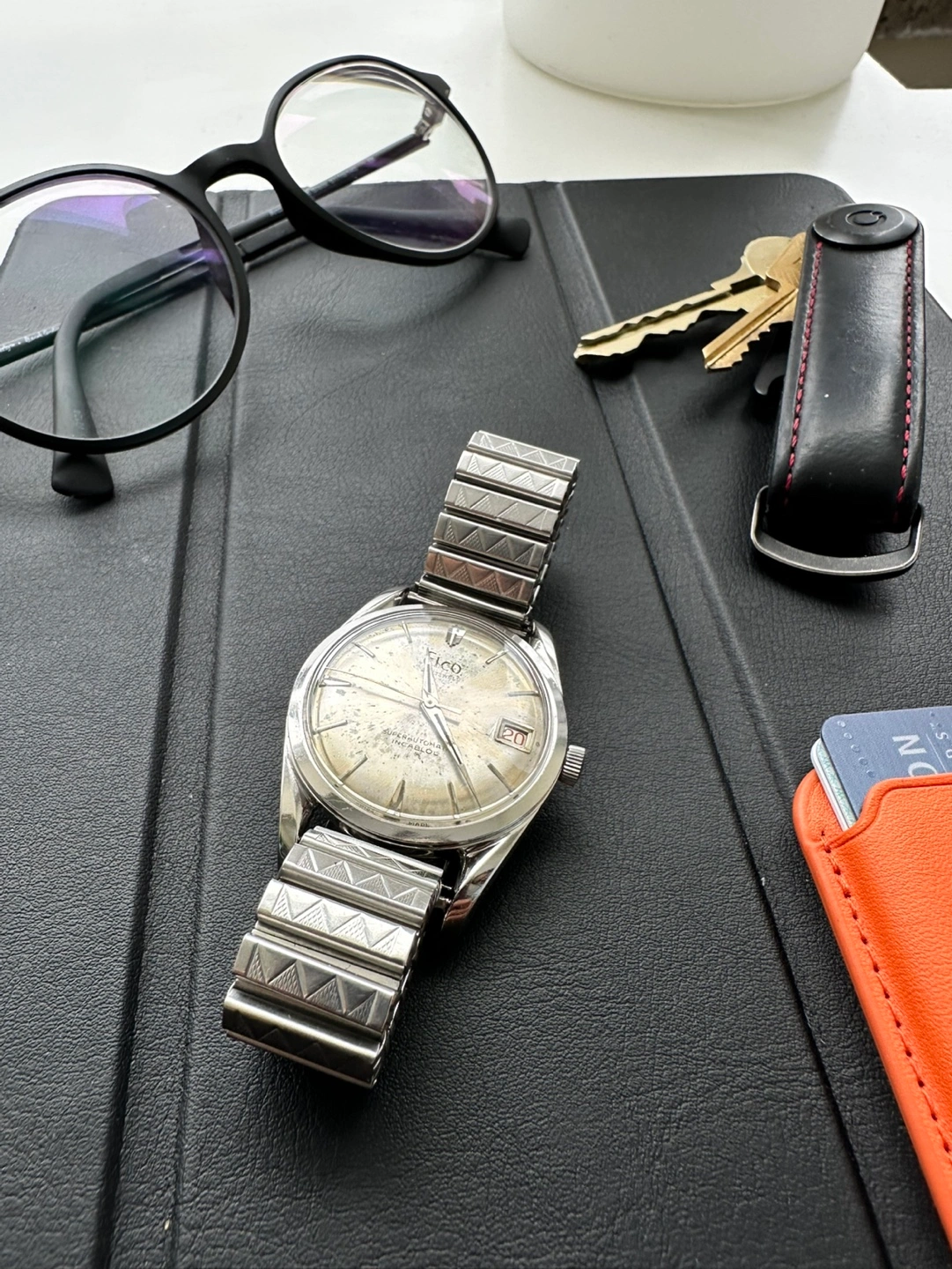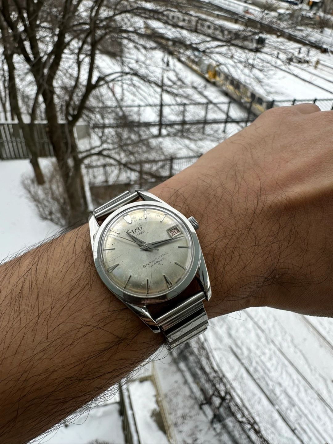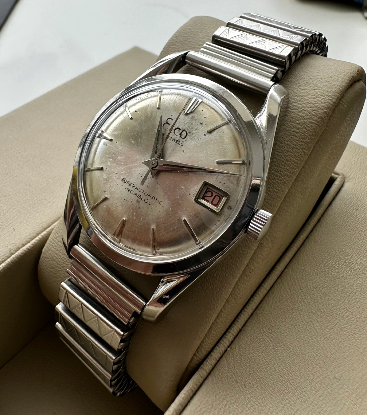 588Swiss Made Elco SUPERAUTOMATIC Watch Polished 33mm silver case and dial with date display Thin case design (10.5mm) Swiss Automatic Movement (AS1701) Incabloc shock resistance system Waterproof Anti-magnetic Full movement service done, regulated for accurate time keeping. New crystal installed for clear view of the dial. Rubber gaskets replaced for improved water resistance. Includes free “Made in Canada” Stainless Steel Fixo-Flex stretch bracelet.