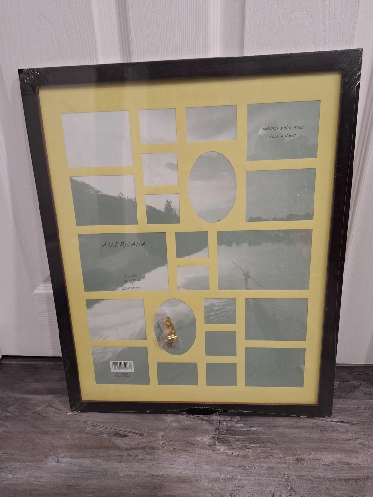 102New multi-photo frame. Natural solid wood frame. Holds 22 photos. Includes hanging hardware.