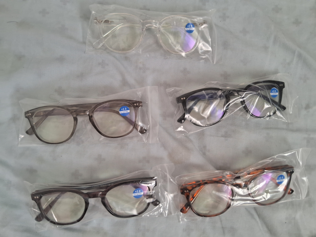 Five pairs of blue light reading glasses. Includes clear, grey, black, tortoise shell frames. +2.0 magnification. New in box.