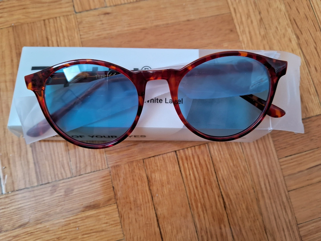 Brand new, never worn. Tortoise shell frame, blue lenses. Comes in original packaging.
