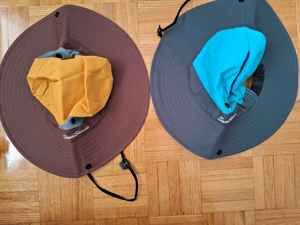 Pair of Sunshade boonie hats. Brown and grey colour. Chin straps. Packable design. Great for summer.