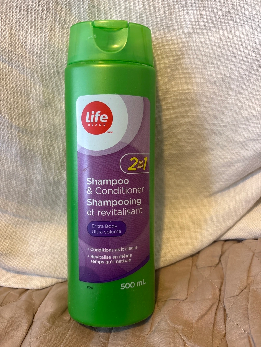Life Brand shampoo and conditioner. 2-in-1 formula. Extra body/ultra volume. Conditions as it cleans. 500ml bottle.