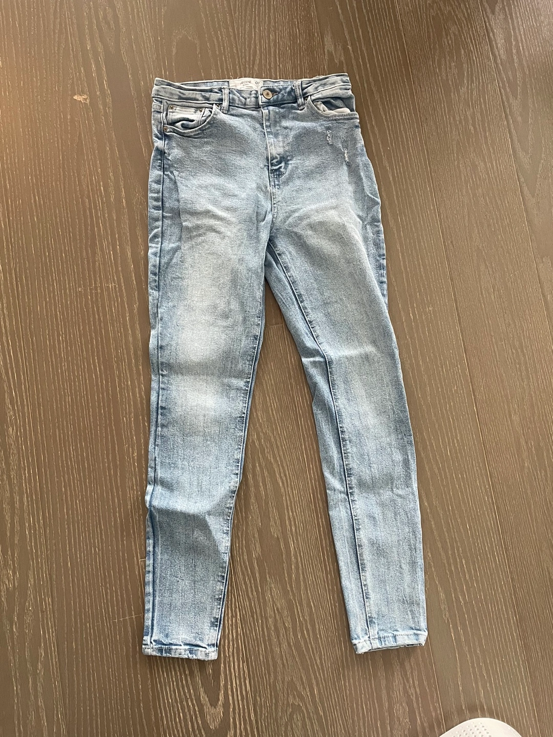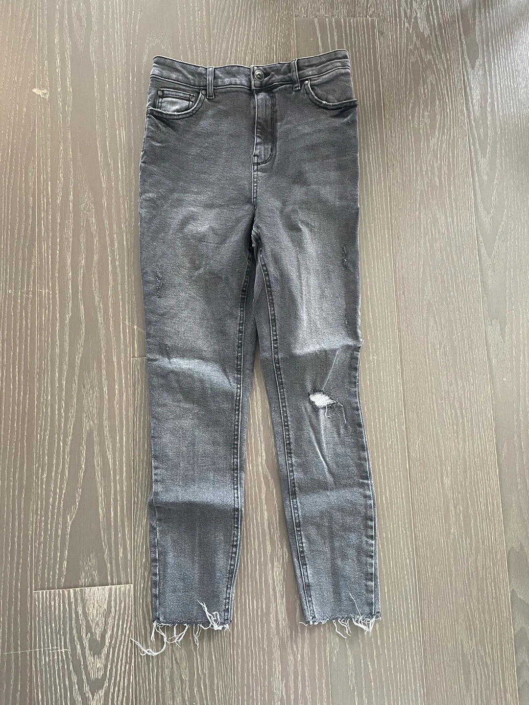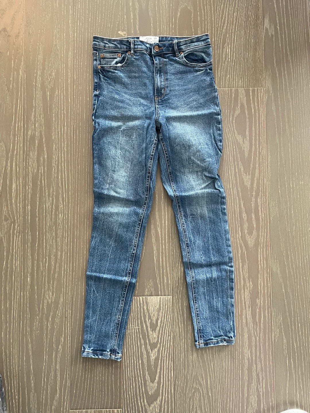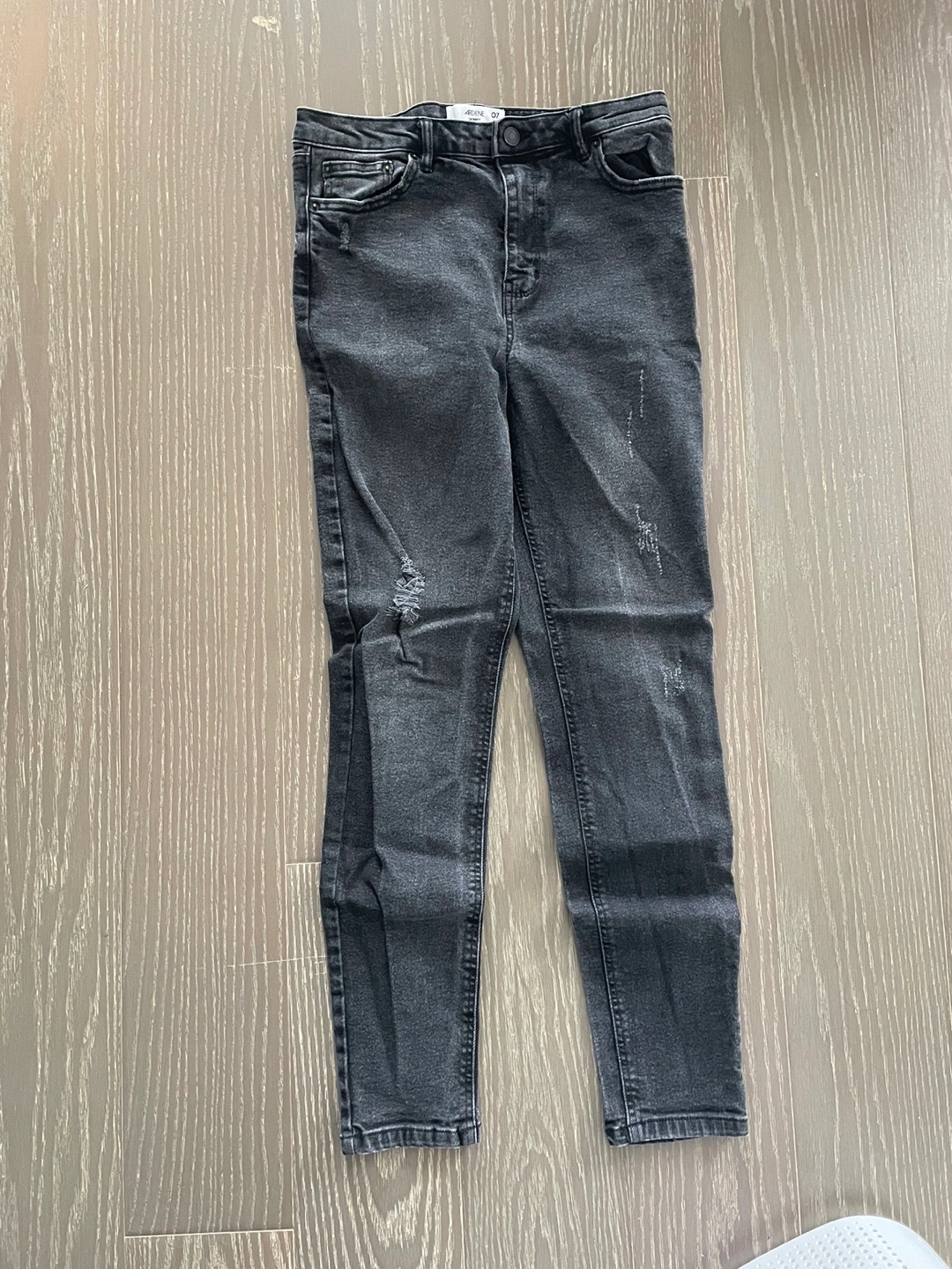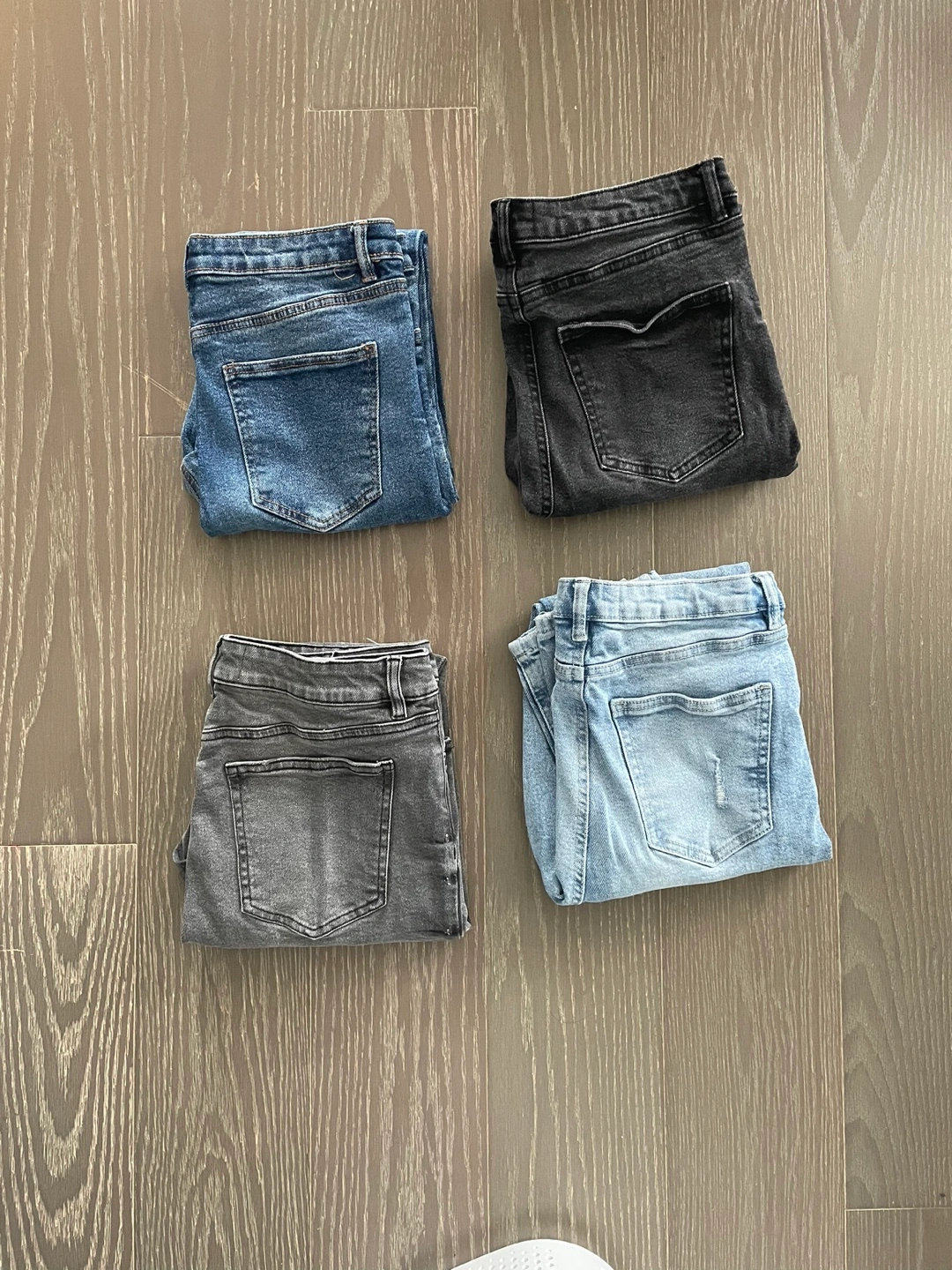 Four pairs of Ardene high-waisted jeans. Skinny fit, size 7. Various washes included: light wash, medium wash, dark wash, and black. $5 per pair or $15 Take All.