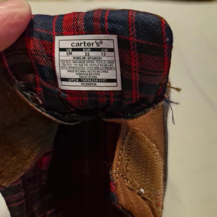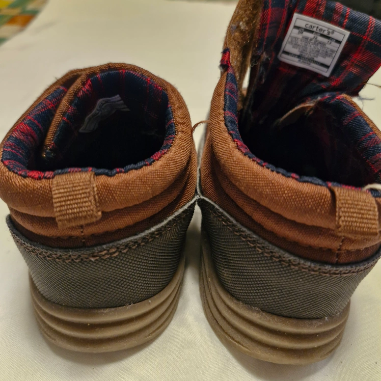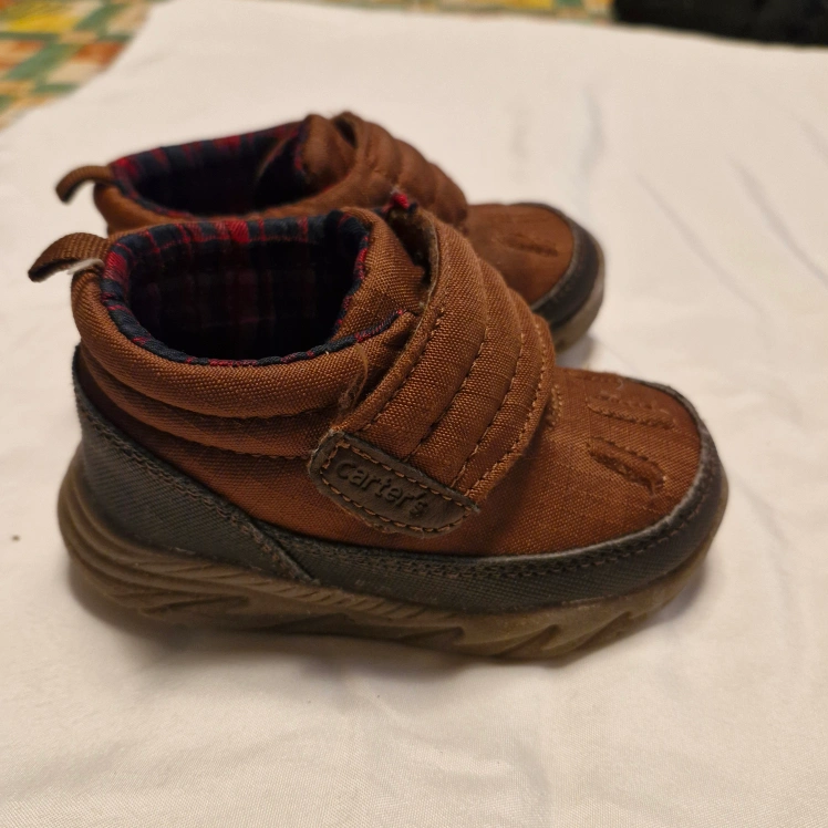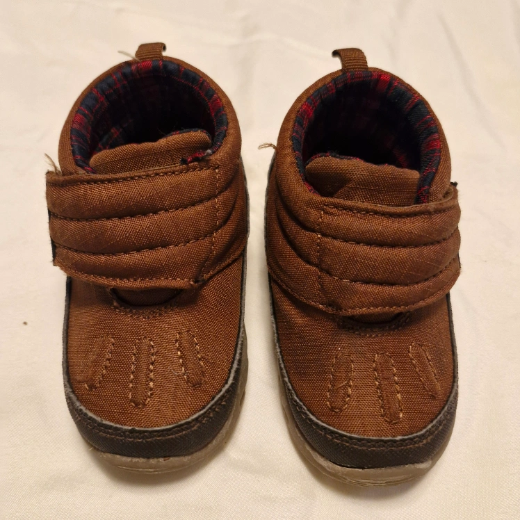 Brown baby boots. Size 6M. Velcro closure. Plaid fabric lining. Good condition.