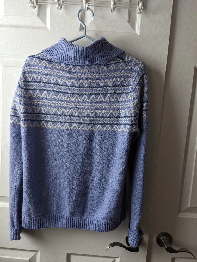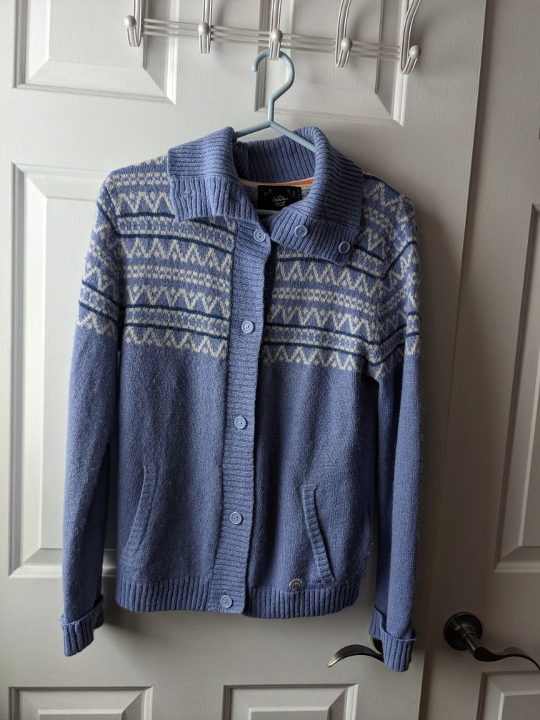1000+Beautiful lavender coloured cardigan. Features a collared neckline, button closure, and a unique patterned design. Long sleeves and ribbed cuffs. Two pockets. Great for layering.